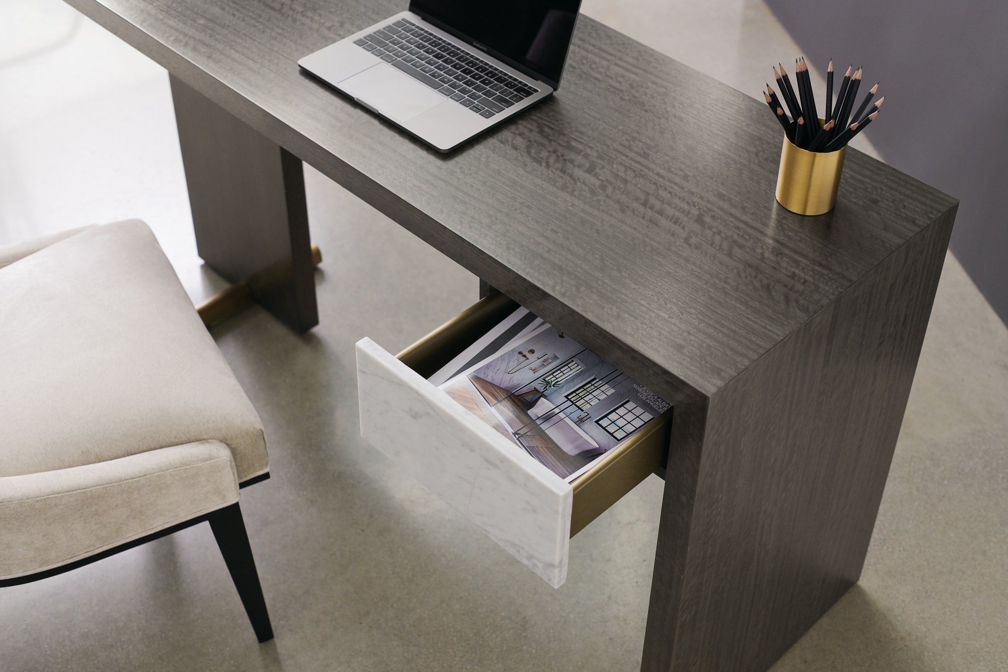 Не ограничивайтесь традиционными стилями! Ваше рабочее пространство может стать современным с помощью письменного стола Edge из коллекции Modern Edge американского бренда Caracole. Корпус, выполненный из шпона фигурного эвкалипта в темной отделке (Shadow), акцентирован металлической опорной ножкой в бронзовом финише (Lucent Bronze). Мрамор каркаса подчеркивает фасад выдвижного ящика и завершает органический образ изделия. Несмотря на минимализм по своей природе, стол поражает роскошным сочетанием материалов.