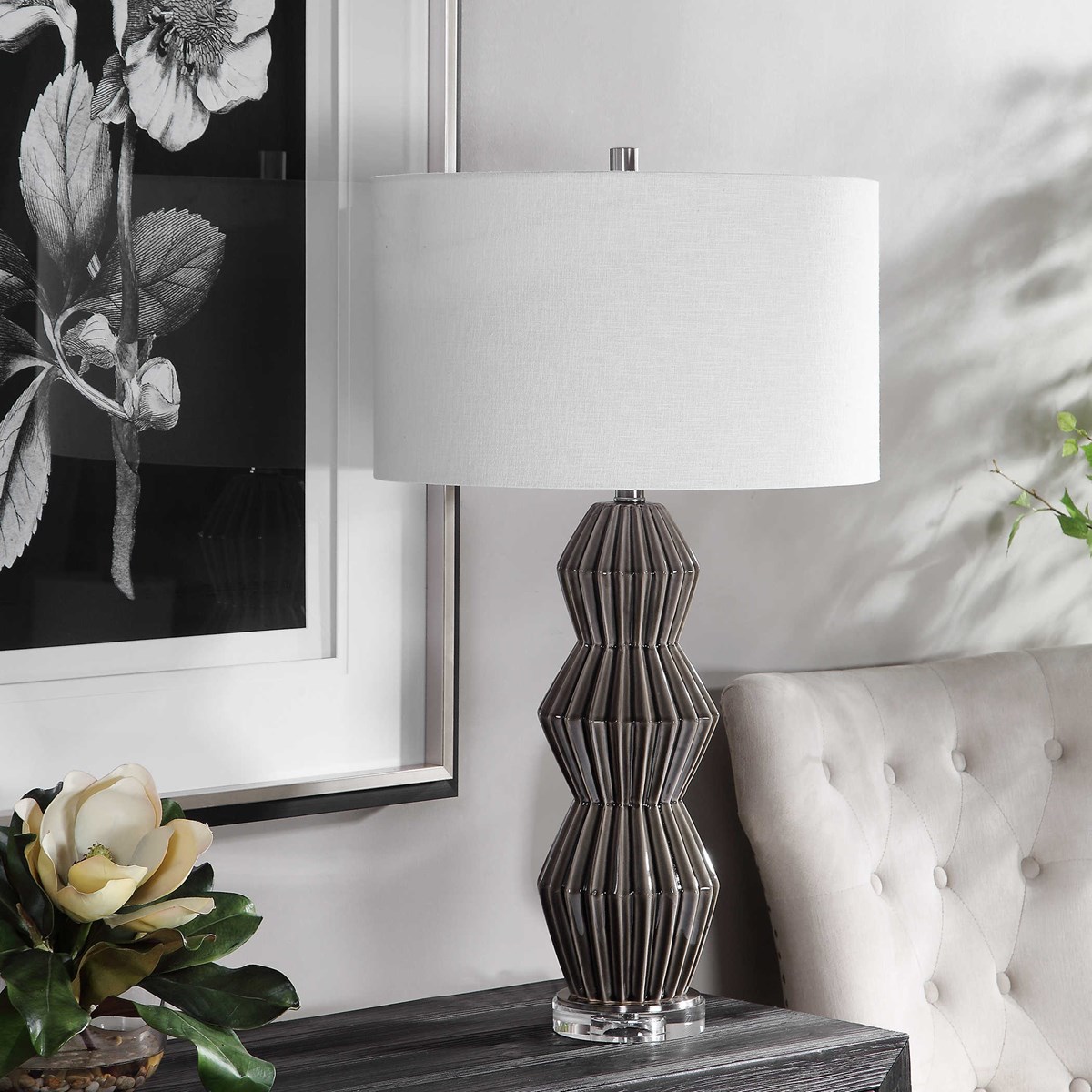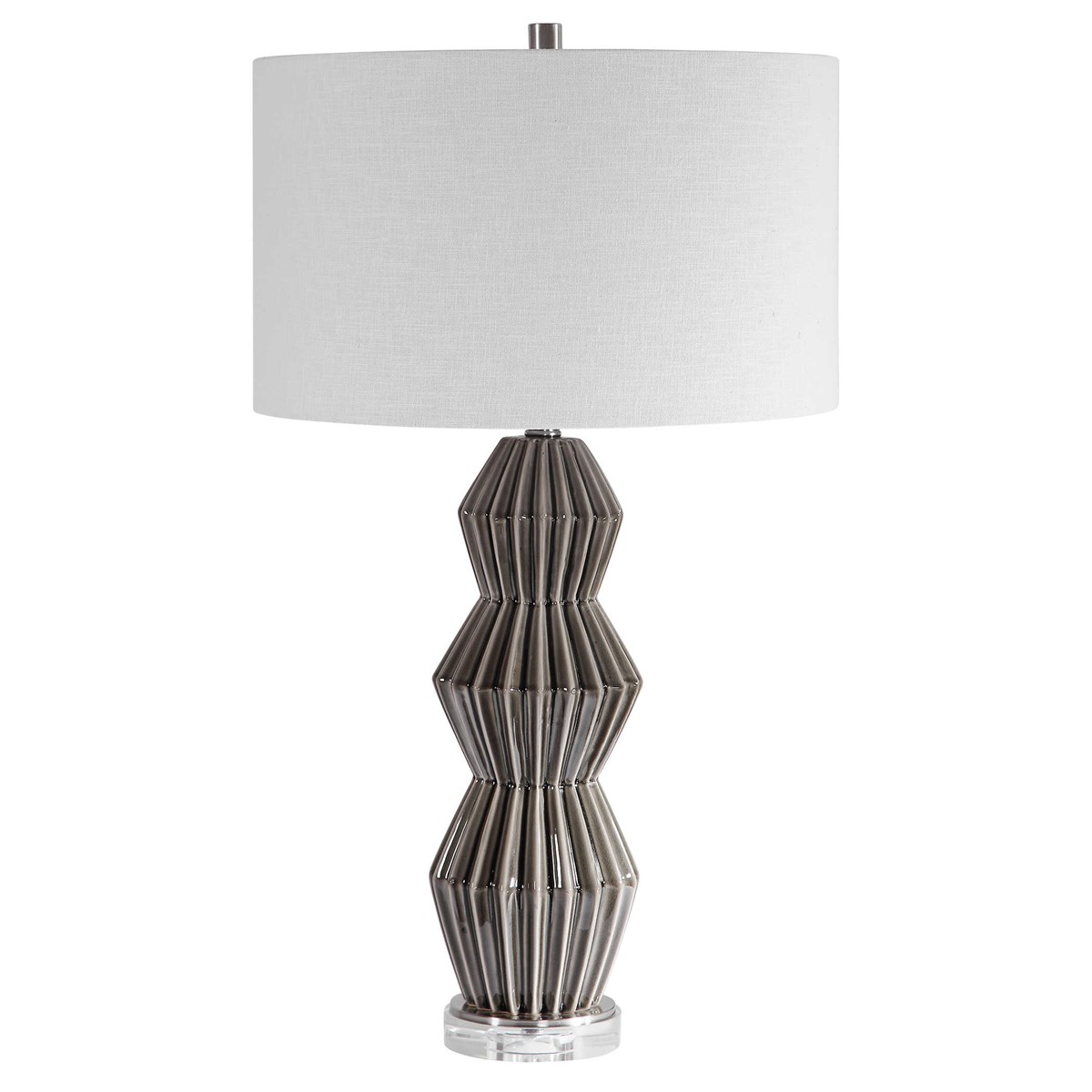Лампа Maxime — это истинное воплощение стиля ретро с геометрическим основанием из керамики. Основание лампы покрыто дымчато-серой глазурью с ребристой текстурой, что придает ей особый шарм. Матовые никелированные детали и толстая хрустальная ножка добавляют изысканности и элегантности этому уникальному изделию.