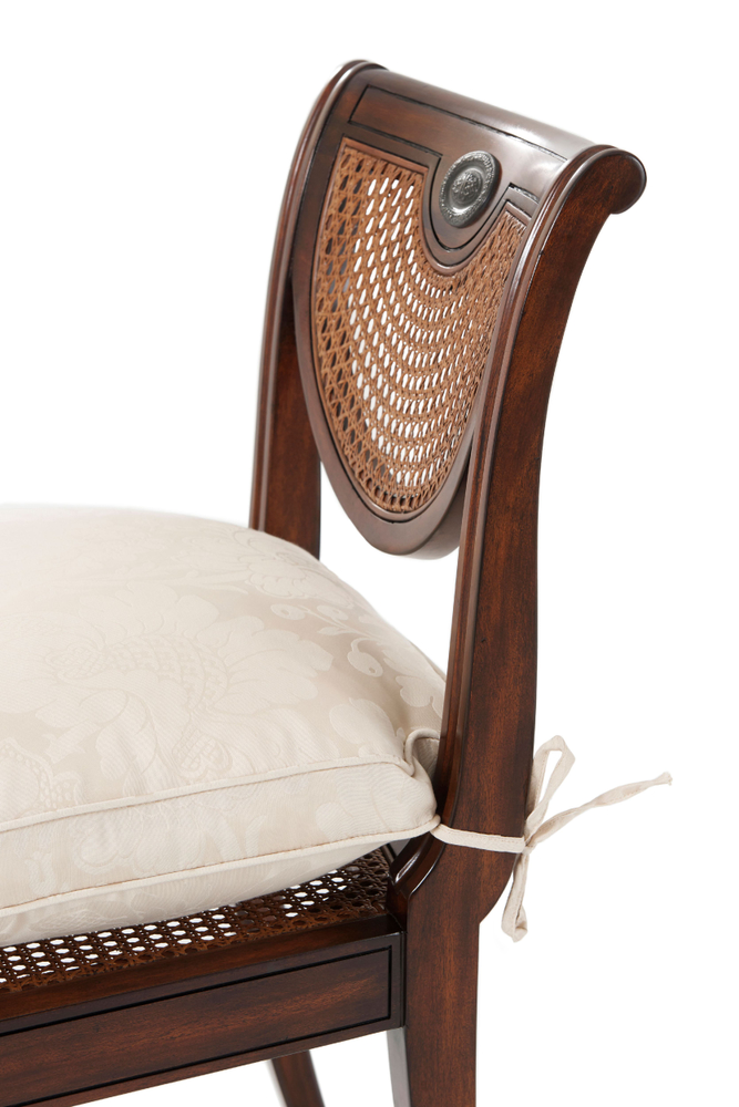 Плетеная спинка создает уютную атмосферу и подчеркивает роскошь этого кресла. Шелковый галстук на подушке сиденья придает ему дополнительный шарм и комфорт.
