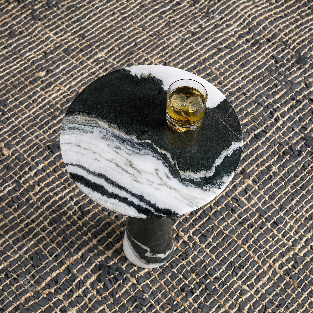Боковой столик Panda выполнен из натурального мрамора с полированной отделкой, которая подчеркивает его органичную современную форму. А латунная втулка добавляет изысканный акцент. Уникальный мраморный узор с прожилками в оттенках черного, белого и зеленого делает каждое изделие неповторимым, отражая природную красоту и разнообразие натуральных материалов.