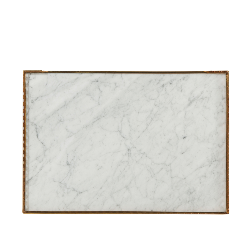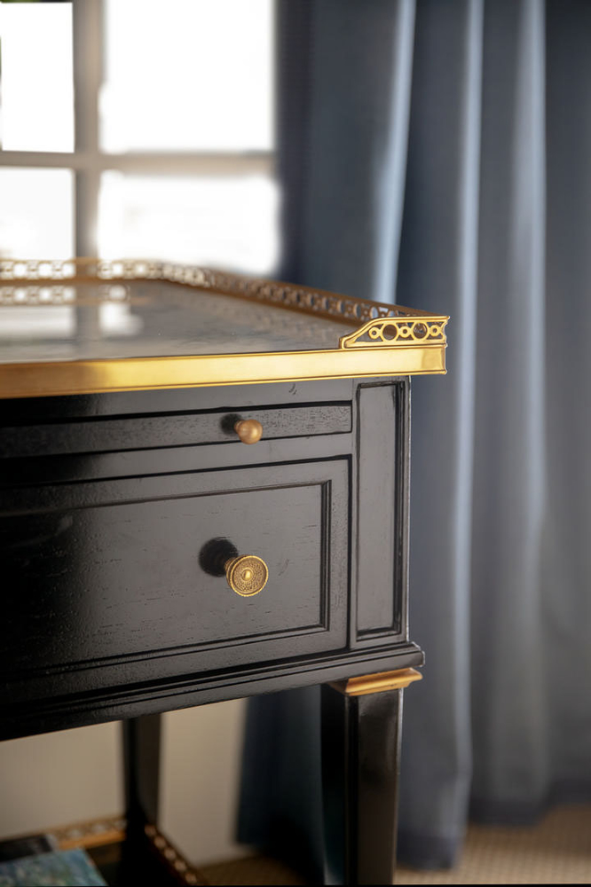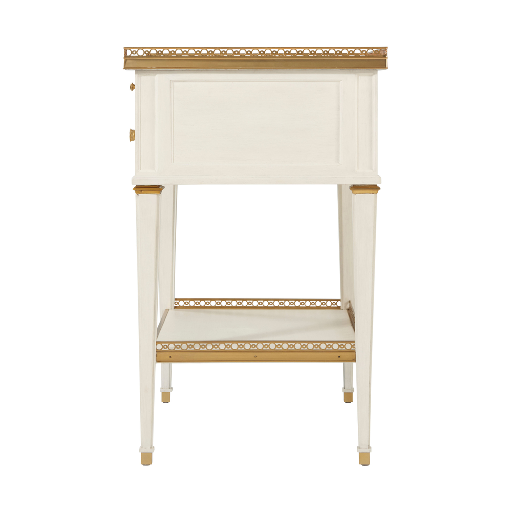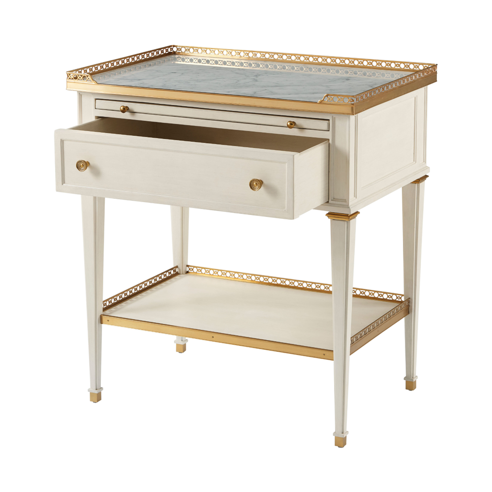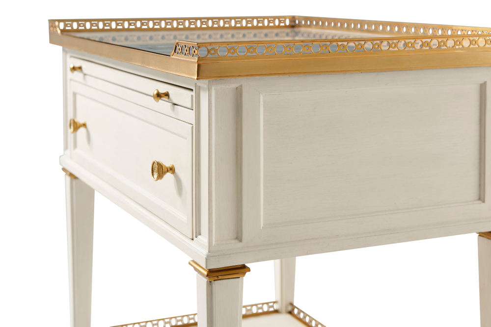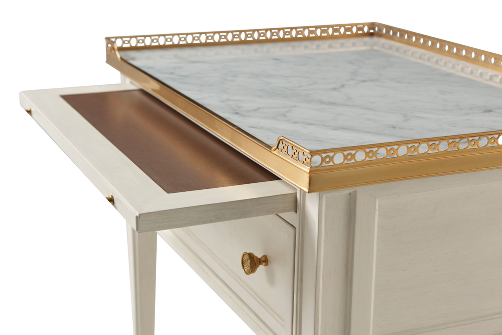 Перфорированная латунная галерея с каррарской мраморной столешницей Бьянко создает изысканный облик, который не оставит равнодушным ни одного ценителя красоты. Выдвижной лоток и один ящик с литыми латунными ручками предоставляют удобное место для хранения, а конические ножки с латунными капителями добавляют структурную элегантность.