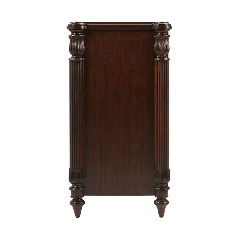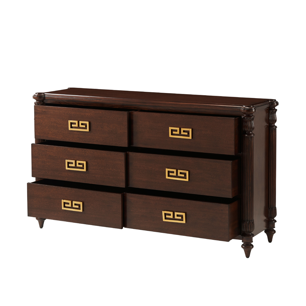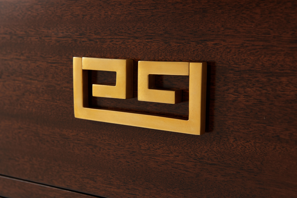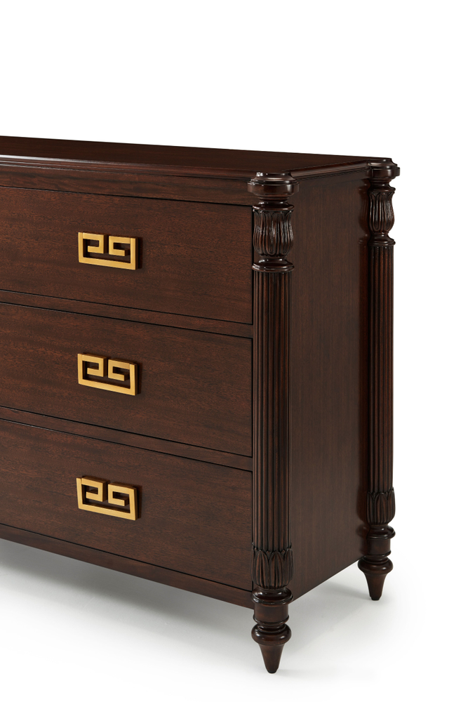 Комод Duane искусно сочетает в себе элегантность французского стиля Directoire и изысканность современных деталей. Рифленые ножки с позолоченными элементами в виде лепестков создают утонченный силуэт, а утопленные латунные тяги для ящиков с греческим ключом придают классическим деревянным фасадам особый шарм. Мраморная столешница в сером оттенке добавляет комоду роскошный акцент, прекрасно сочетающийся с отделкой Cambridge. В комплект входит система для защиты от опрокидывания, обеспечивающая безопасность использования.