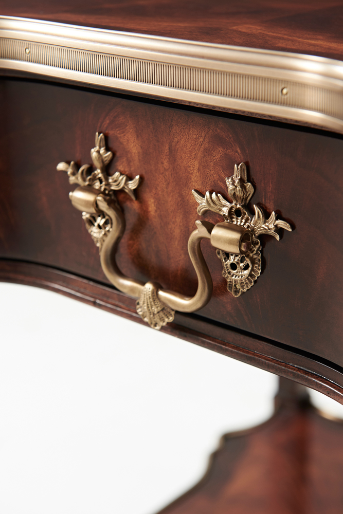 Боковой столик In The Grand Manner — это ламповый столик, который привносит в интерьер нотки роскоши и изысканности. Изготовленный из красного дерева и отделанный огнеупорным шпоном, столик отличается змеевидной квадратной столешницей с элегантными латунными вставками. Под столешницей расположен выдвижной ящик с фигурным фризом и литой латунной ручкой Rocaille, добавляющей изделию декоративности. Квадратные сужающиеся и рифленые ножки с изысканными круговыми узорами, соединенные змеевидной латунной вставкой, завершают образ этого элегантного предмета мебели.