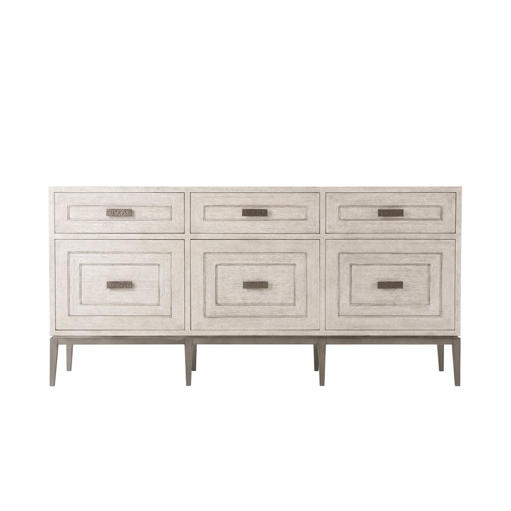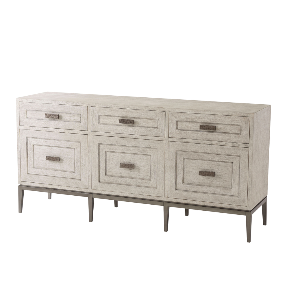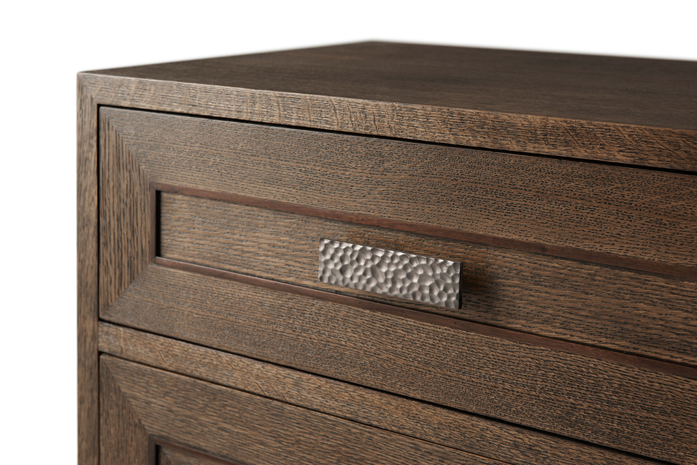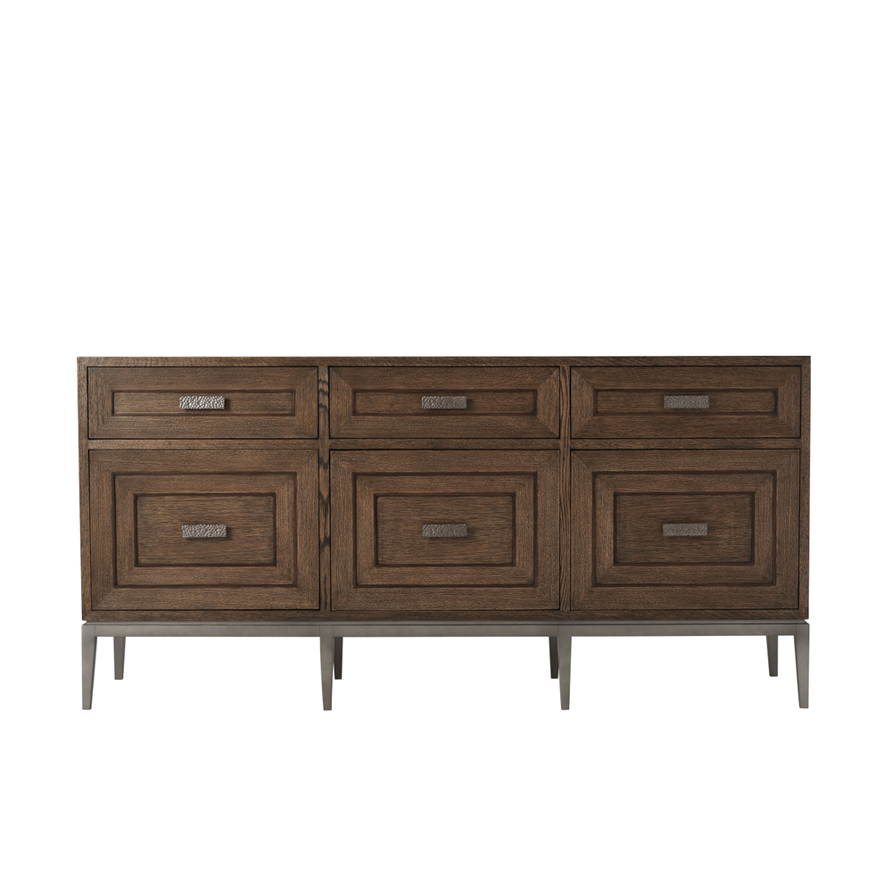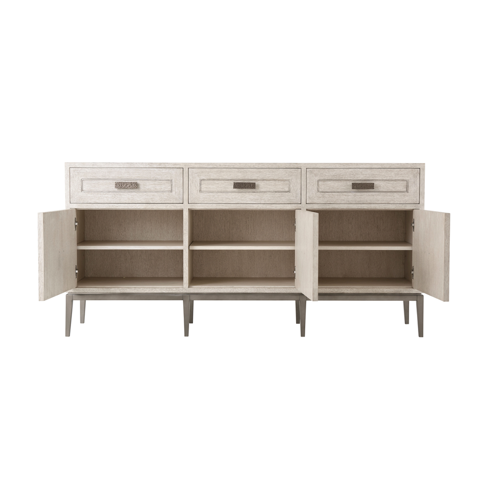 Буфет Giacomo представляет собой гармоничное сочетание формы и функции, выполненное из кварцевого дуба в отделке Charteris или Gowan. Три фризовых ящика украшены рельефной инкрустацией с угловыми центрическими линиями, которая повторяется на трех нижних дверцах шкафа. Ручки из молотого металла с матовой вольфрамовой отделкой добавляют современный штрих, а ножки с аналогичной отделкой придают мебели утонченность. В комплекте предусмотрен набор для защиты от опрокидывания, а ящики оснащены бегунками для плавного закрывания, что обеспечивает удобство и безопасность использования.