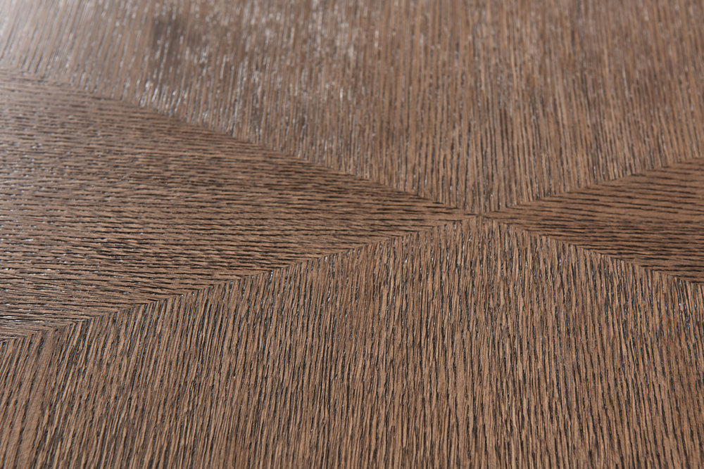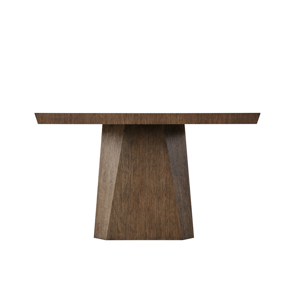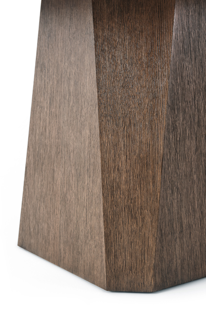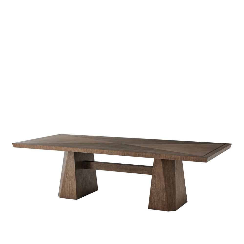 Стол Vicenzo — это сочетание элегантности и современного дизайна. Выполненный из шлифованного квартованного дуба, облицованного ореховым деревом, он имеет отделку Gowan или Charteris, которая подчеркивает его естественную текстуру. Прямоугольная столешница со скошенными краями изящно поддерживается двумя коническими геометрическими основаниями, придающими столу уверенный и статный вид.