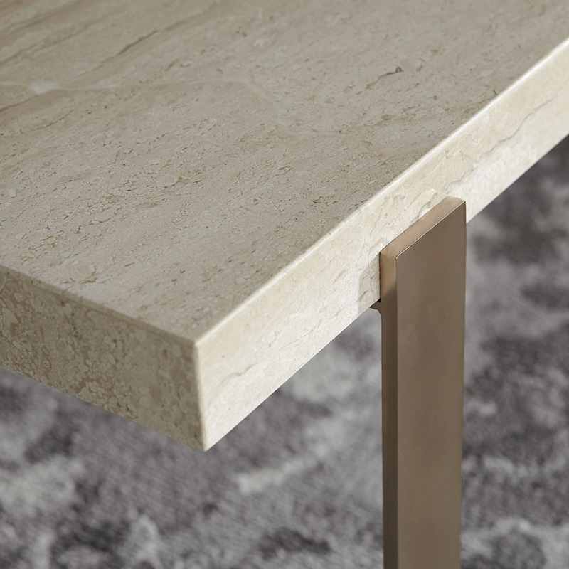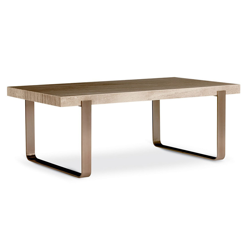 Стильный журнальный столик Griffith имеет красивую столешницу, изготовленную из плиты полированного травертина, которая поддерживается двумя металлическими пластинами в форме обода. Столик внесет в интерьер монументальность природных материалов и легкость универсального стиля модерн.