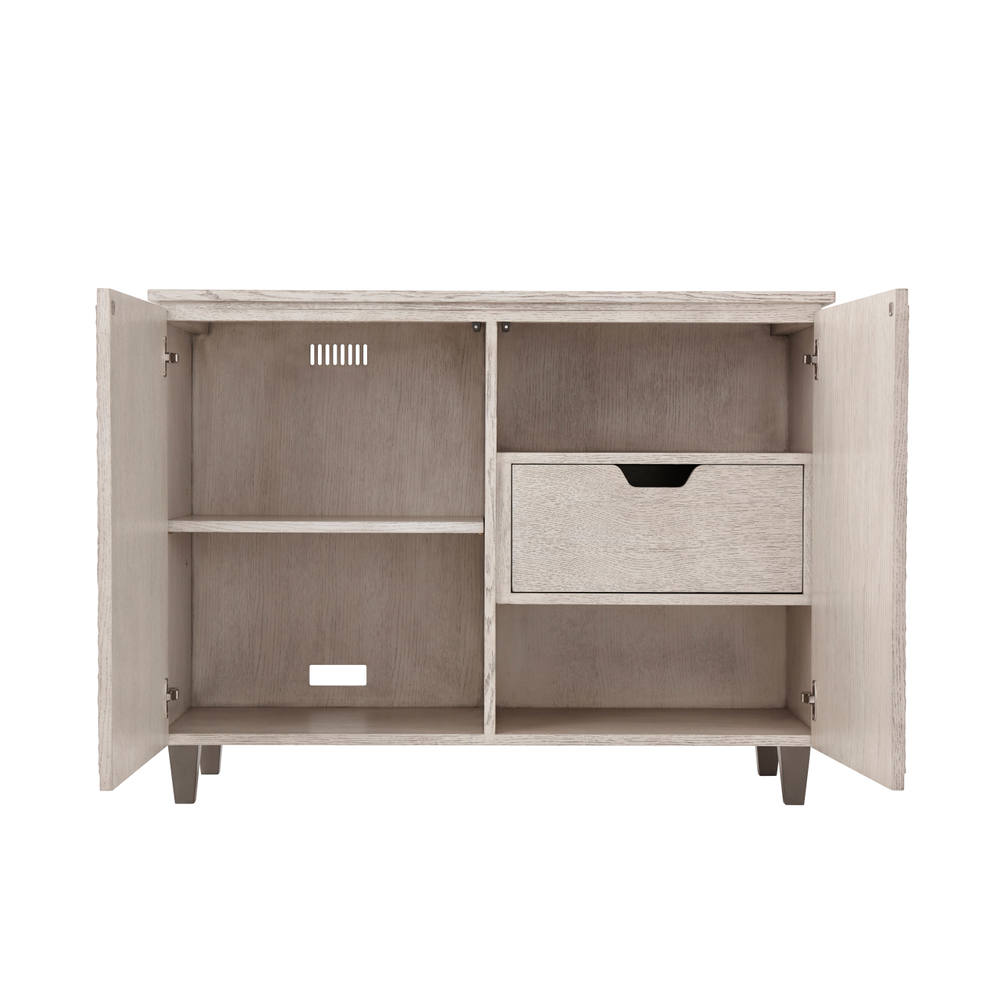 Этот шкаф оборудован двумя дверьми, которые открываются, предлагая функциональное пространство для хранения. Одна секция шкафа оснащена регулируемой полкой, которую вы можете настроить в соответствии с вашими потребностями. В другой секции расположен ящик и две открытые полки, предлагая вам возможность организовать и показать свои предметы.