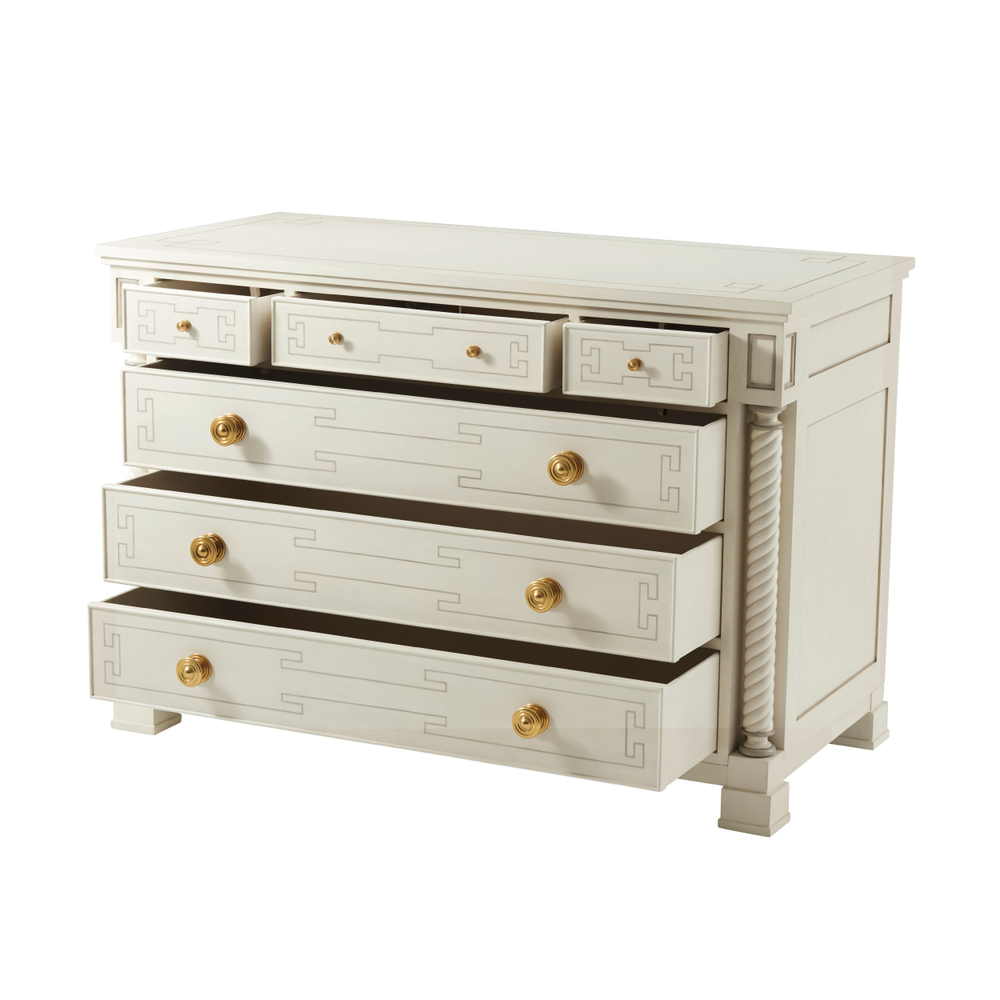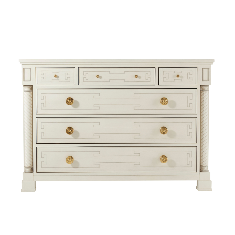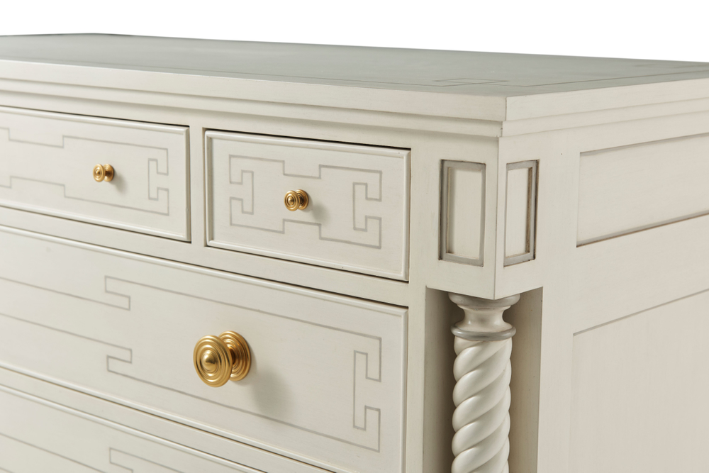 Комод Cecil, вдохновленный классическим дизайном, сочетает в себе элегантность прошлого с современными деталями, идеально вписываясь в интерьер спальни или гостиной. Верхние три выдвижных ящика с изысканным фризом расположены над тремя вместительными ящиками, украшенными изящными латунными ручками. Обрамленный грациозными спиральными колоннами и установленный на элегантных ножках, этот комод излучает утонченность и придает пространству благородный акцент.