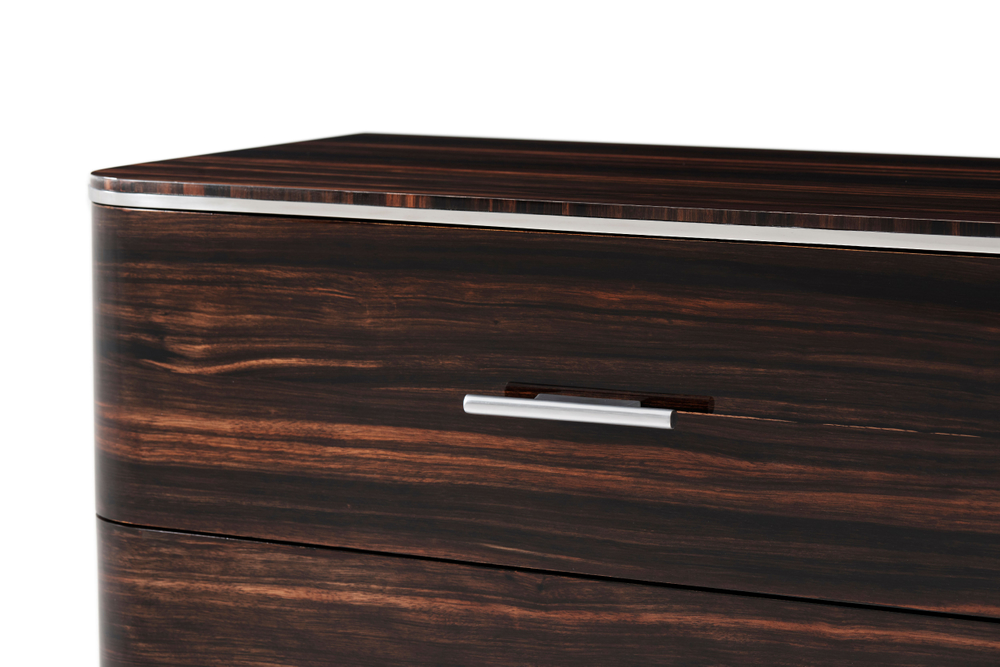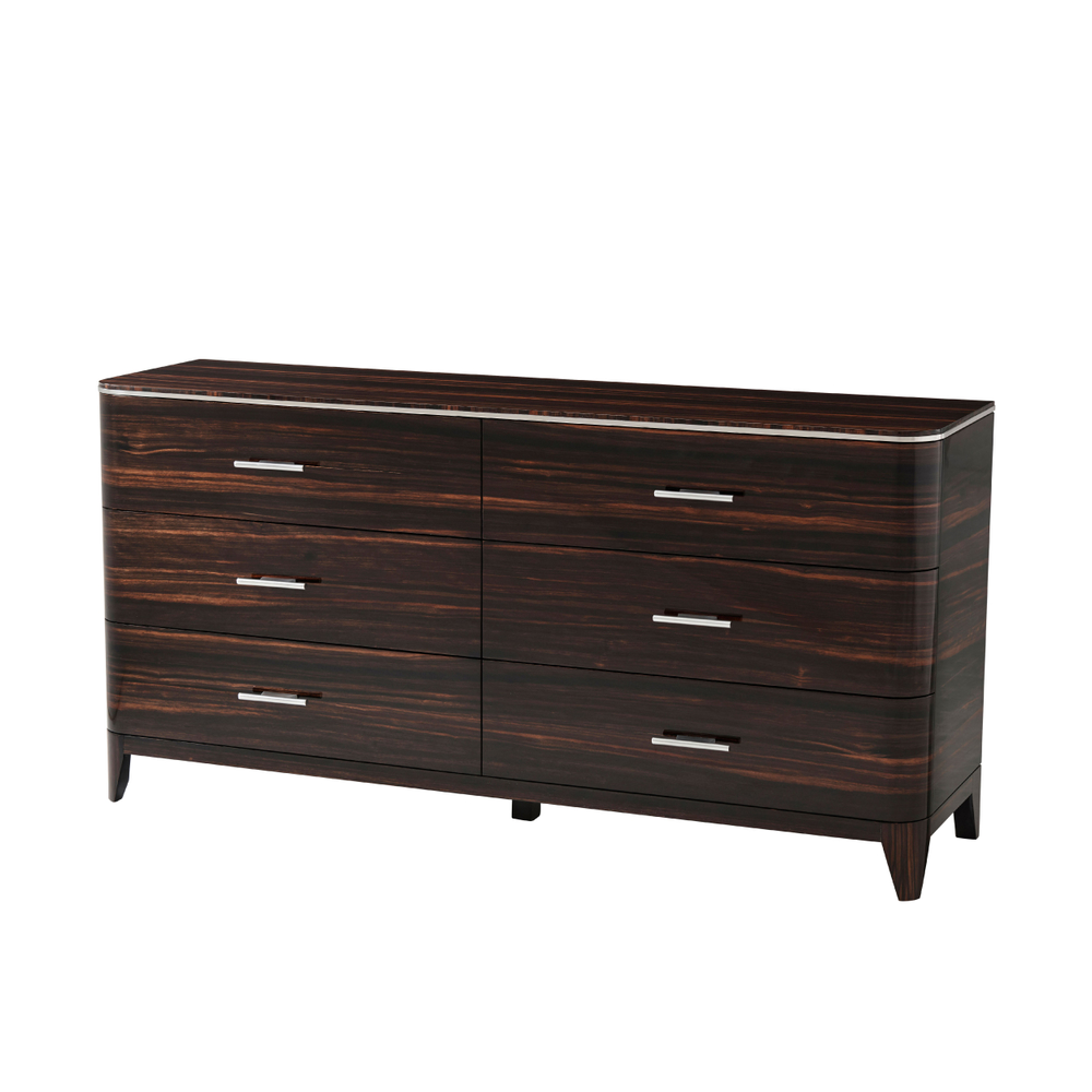 Комод The Knickerbocker впечатляет элегантностью и утонченным дизайном. Верх с закругленными краями и отделкой из полированного никеля сочетается с роскошным шпоном амары, придавая изделию изысканный вид. Шесть просторных ящиков с ручками из полированного никеля обеспечивают удобное хранение, а сужающиеся ножки из того же шпона подчеркивают безупречный стиль, делая The Knickerbocker акцентным предметом в любом интерьере.