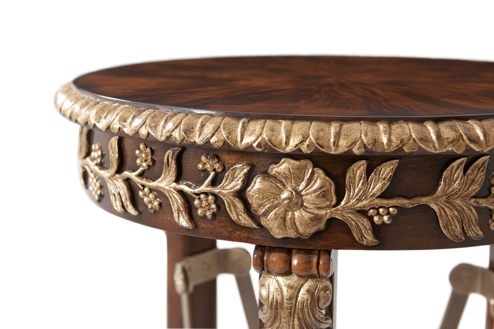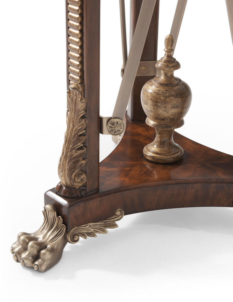 Этот изысканный боковой стол Classical, выполненный в классическом стиле, излучает непередаваемую роскошь. Его резной верх, покрытый позолотой, обрамлен изысканным краем и фризом. Три изящные опоры украшены акантовыми элементами и поднимаются на латунные лапы, моделированные в форме крылатых львов. Величественное основание в виде трилистника придает столу элегантный завершающий штрих. Центральная X-образная структура оснащена латунным кольцом и украшена патерами в виде цветочных головок, придающими этому столу особый характер.