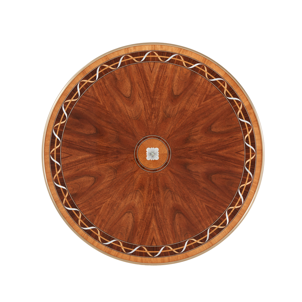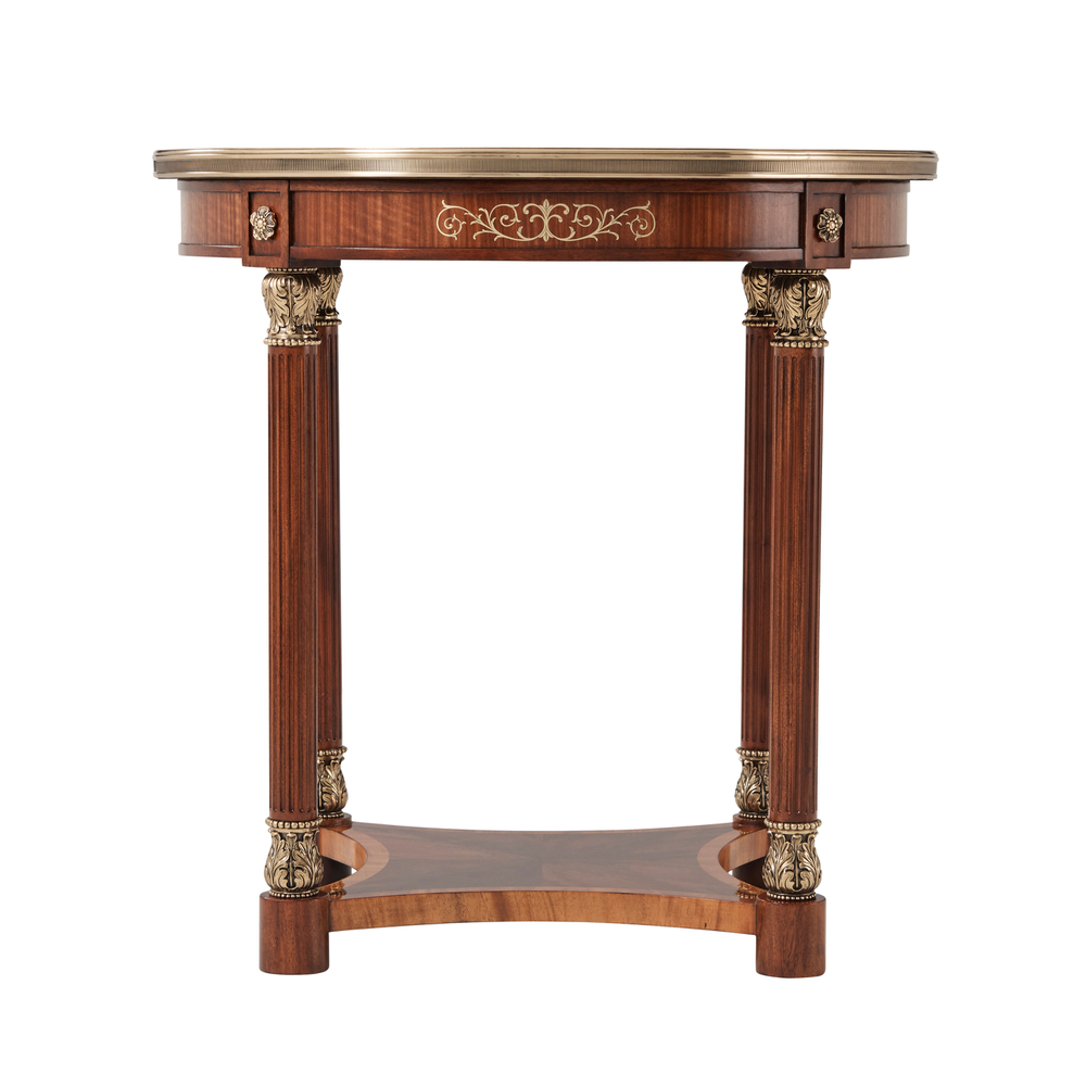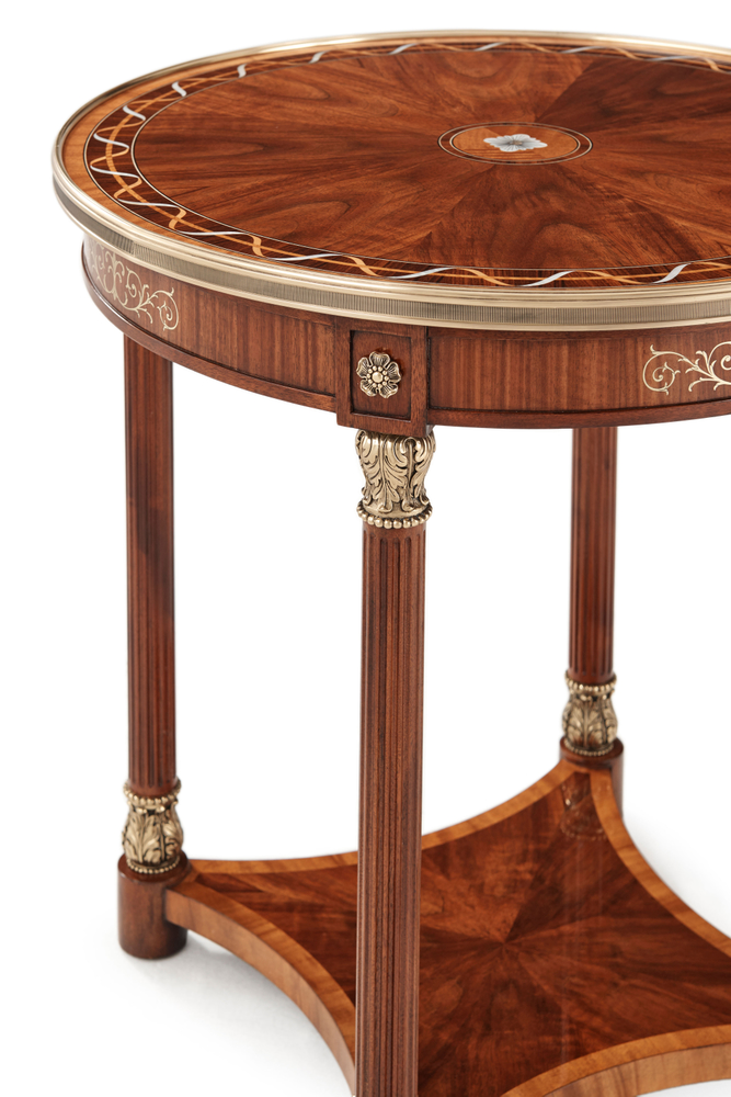 Изысканный боковой столик Paulette II, выполненный из красного дерева и шпона этимо, привлекает внимание своим утонченным дизайном. Столешница украшена поперечными полосами из дерева Morado и Primavera, дополненными тонкой резьбой и маркетри из платана и перламутра. В центре расположен хоровод из цветочных головок с перламутровыми деталями, искусно скрепленными латунью. Панельный фриз столика дополнен цветочными латунными акцентами и инкрустацией, которая гармонично перекликается с рифлеными колоннами, завершенными акантовыми капителями и базами. Колонны соединены поперечными полосами из дерева Primavera, поддерживающими вогнутую нижнюю поверхность, что придает столу изысканную симметрию и элегантность.