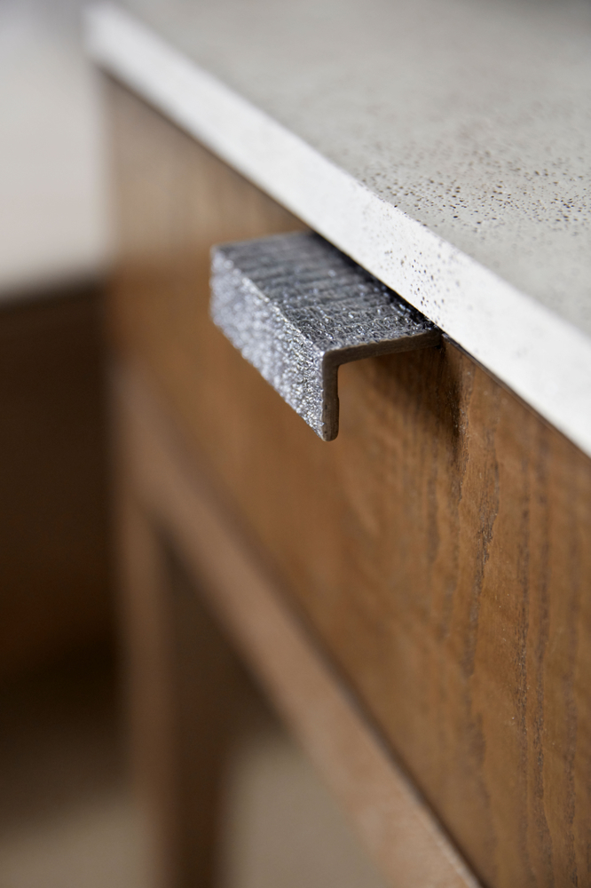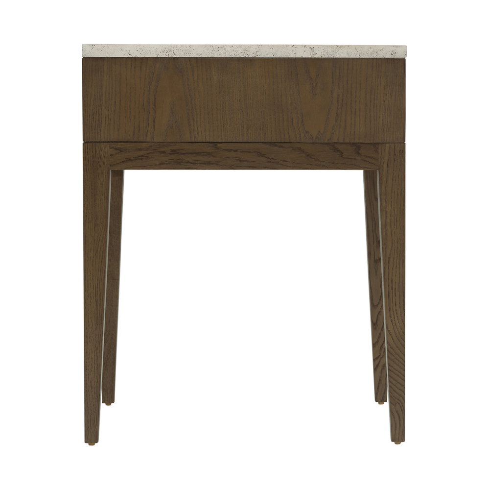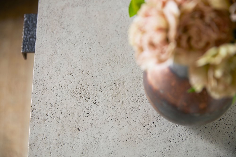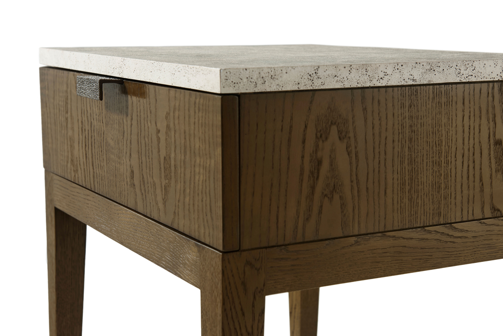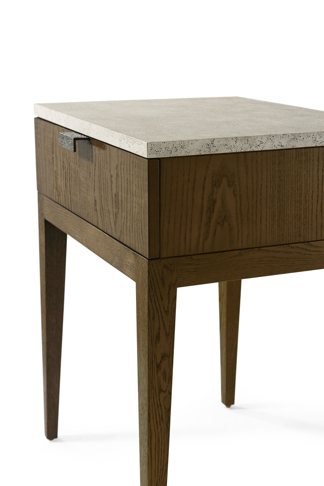 Она также впечатляет текстурированной металлической вставкой в отделке Ember, которая добавляет этой тумбочке особый акцент и структуру. Сверху у нее каменная пористая столешница, отделанная в нашей эксклюзивной минеральной отделке, что придает ей роскошный и современный вид.