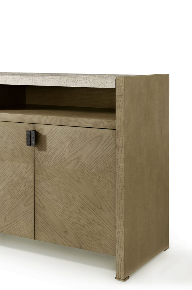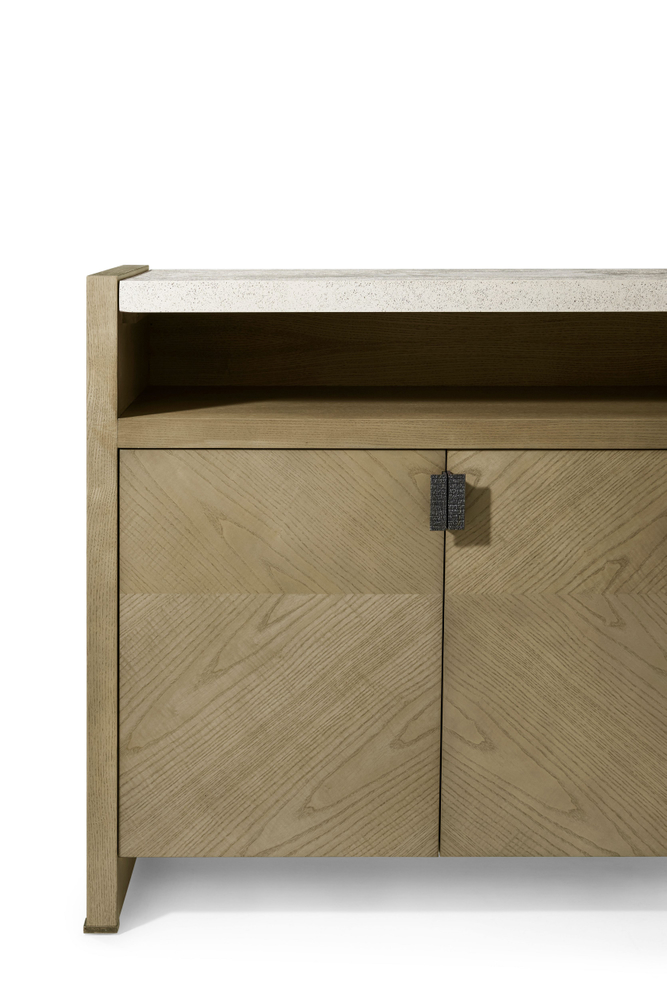 Минималистичный четырехдверный буфет Catalina привлекает внимание спокойной симметрией и текстурой из фигурного ясеня. Доступный в оттенках Dune или Earth, он дополнен металлическими тягами цвета Ember и столешницей с пористой отделкой Mineral, имитирующей камень. Внутри буфета находятся регулируемые полки, обеспечивающие удобное хранение и организацию.