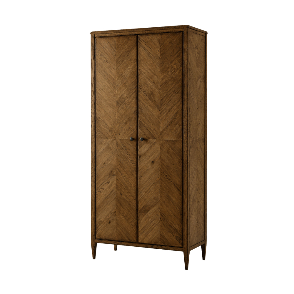 Шкаф Nova впечатляет своим стильным и изысканным дизайном. Он оснащен двойными дверями, выполненными из зеркального паркета из дуба в форме елочки. Этот элегантный элемент придает шкафу особый шарм и создает ощущение простора и света.