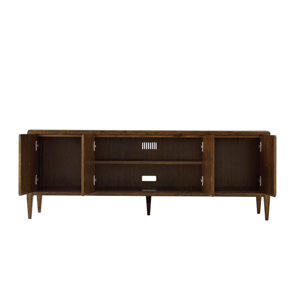 Утонченный дизайн тумбы под ТВ, названной Social Media, сразу привлекает внимание. Ее двери украшены тонким, но нетрадиционным паркетом из дуба, который действительно завораживает. С прямоугольной дубовой столешницей, показанной здесь, и четырьмя дверцами из дуба в отделке Dusk, эта консоль становится настоящим украшением интерьера.