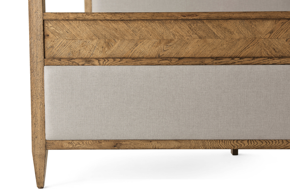 Кровать Nova Canopy, впечатляющая king-size кровать, выполненная из дуба и представленная в отделке Dawn Finish. Ручная работа и мастерская изготовка из массива дуба сочетаются с изысканной маркетри в виде елочки, создавая впечатляющую деталь с мягкой панелью как на изголовье, так и на изножье.