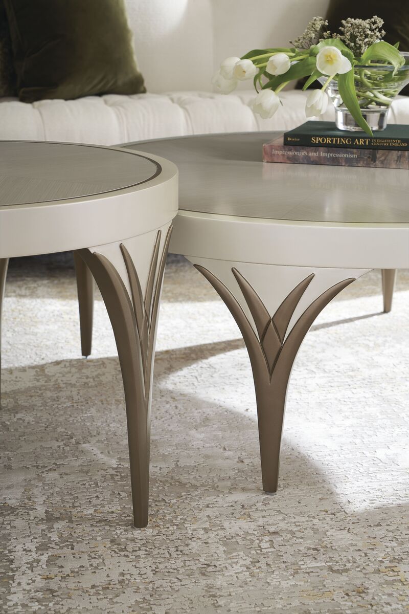 Журнальный столик Valentina обретает непринужденную элегантность благодаря своей матово-жемчужной отделке, что делает его идеальным для группировки или использования в отдельности как акцентного элемента. Он моментально привлекает внимание благодаря своей серебристой столешнице из сандалового дерева, на которой вырезаны изысканные детали в форме резного бриллианта, подчеркнутого золотистым мерцанием Gold Shimmer.