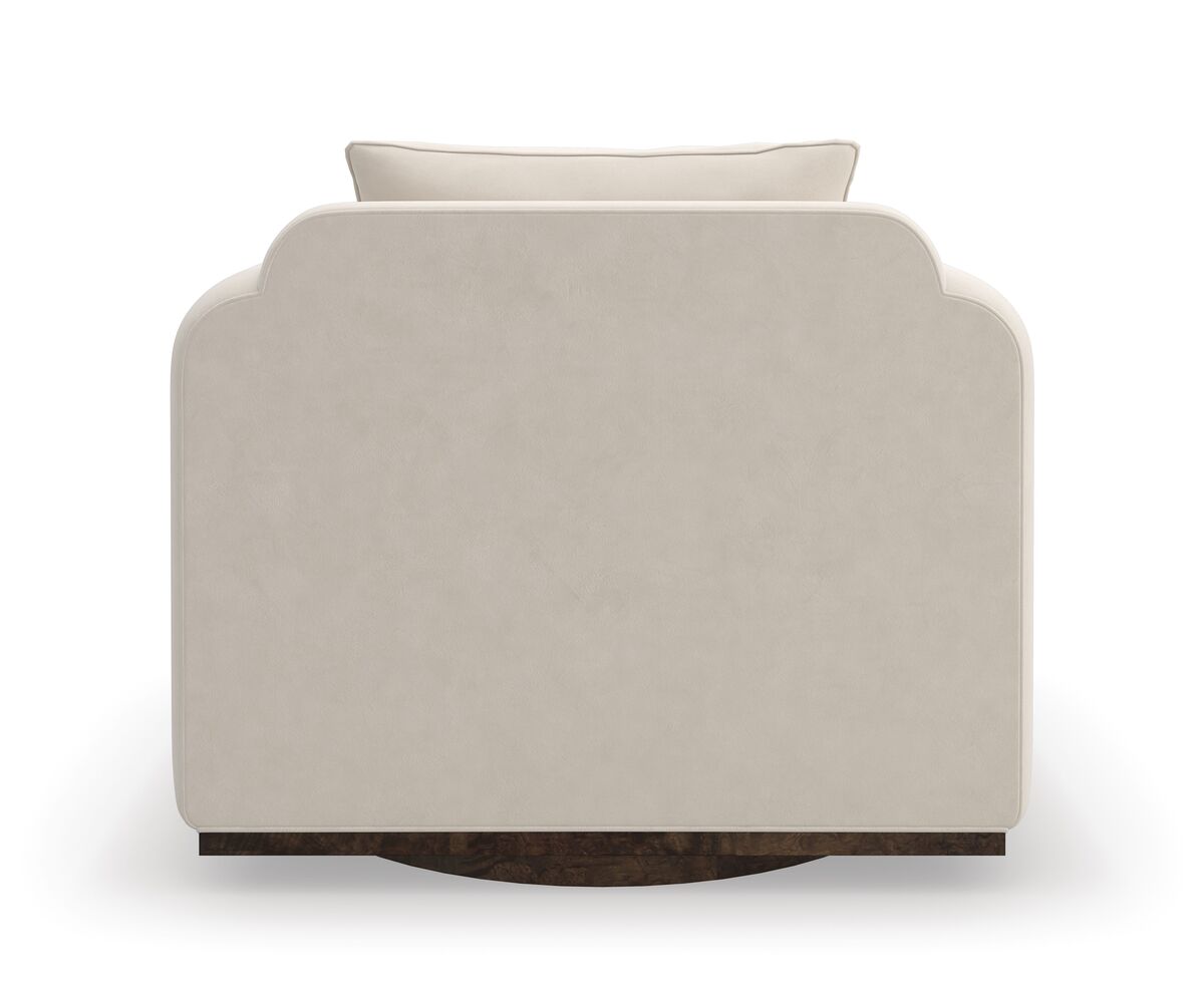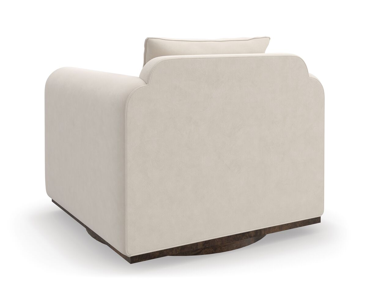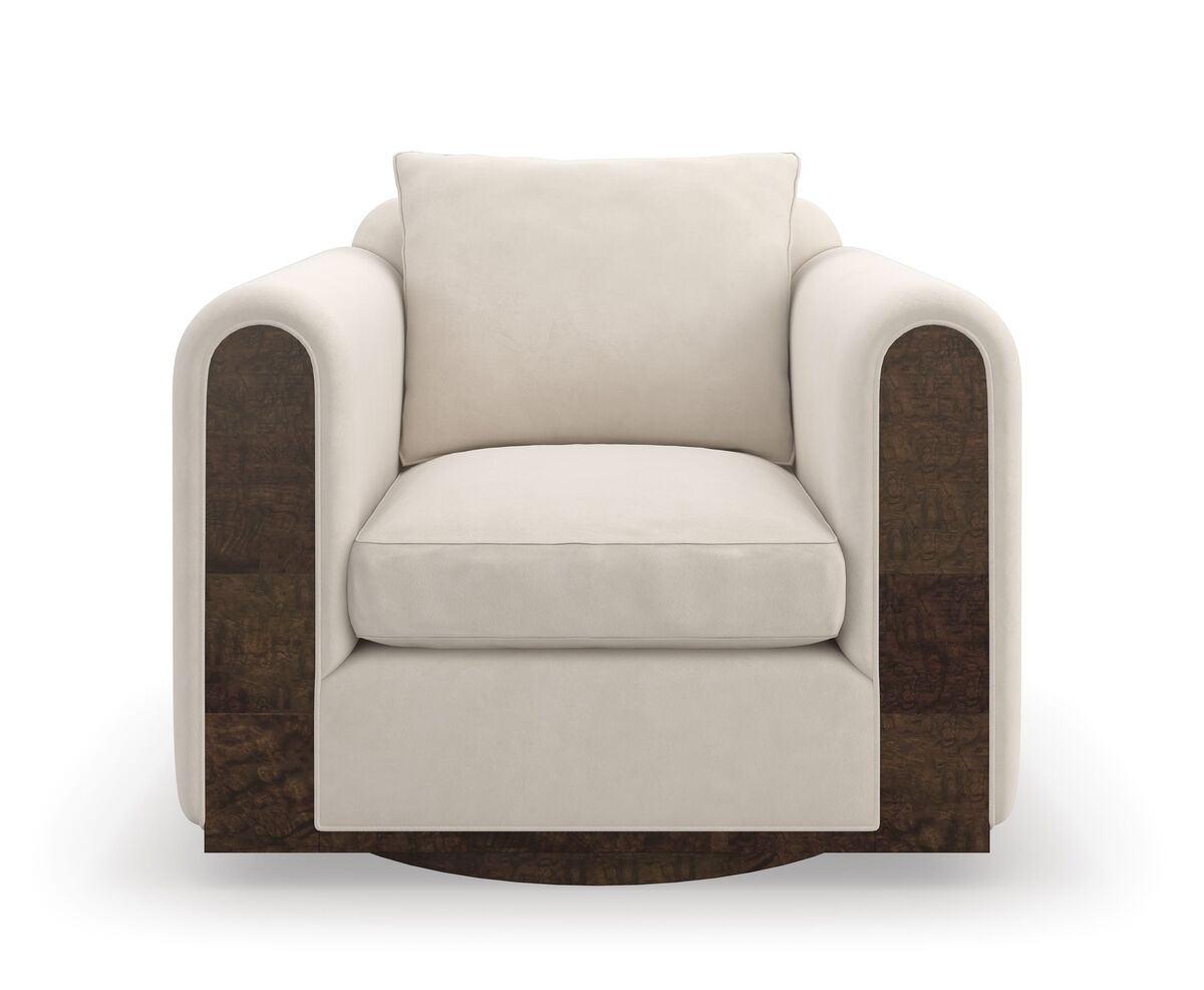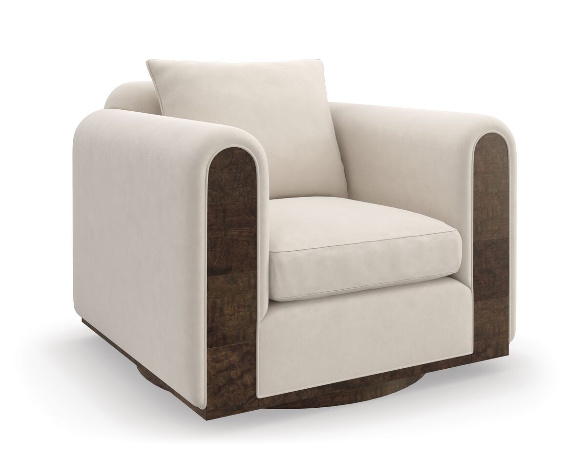 Это просторное кресло из искусственного бархата цвета яичной скорлупы, дополняющее наш диван Dimitri, воплощает гармонию и органическую плавность. Мягко закругленные подлокотники, спускающиеся вниз и огибающие круглое основание, подчеркиваются вставкой из дерева Galway Mappa Burl. Это кресло добавляет изысканности и комфорта в интерьер, предлагая привлекательное место для отдыха и расслабления.