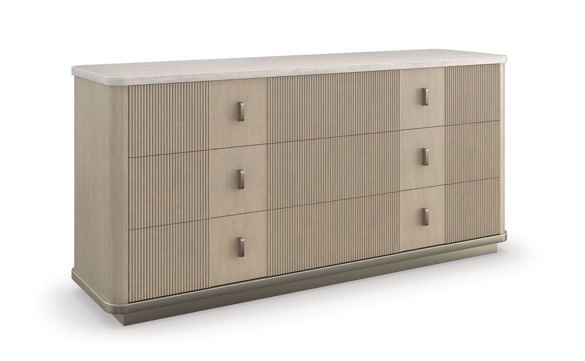 Фасады ящиков с тактильными язычками, отделанными Sun Drenched Oak, создают великолепный визуальный ритм, в удачном сочетании с кремовой столешницей из камня травертин на комоде Rhythm. Скругленные углы и бронзовые ручки с тонким контуром придают линейной форме нежный акцент и добавляют тепла. Шесть вместительных ящиков с внутренней отделкой из льняного лака обеспечивают аккуратное хранение необходимых предметов в спальне или в качестве консоли, добавляя в интерьер живой акцент.