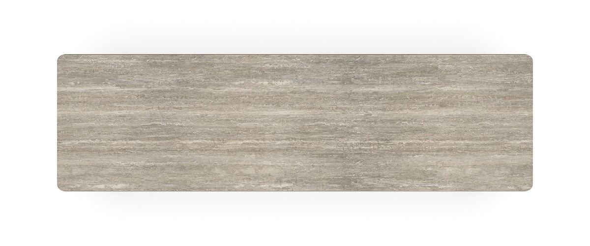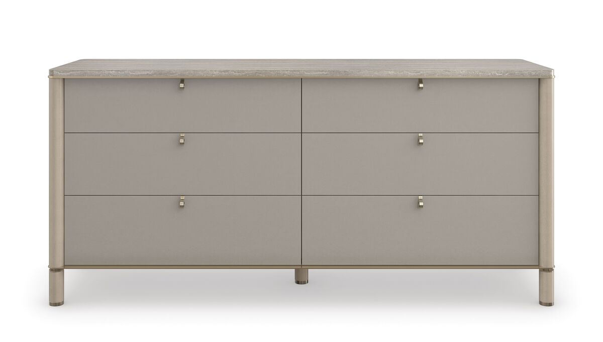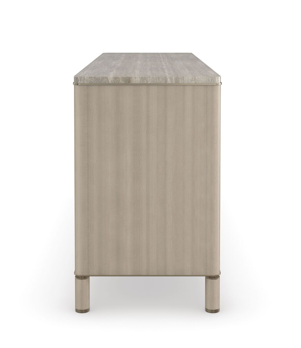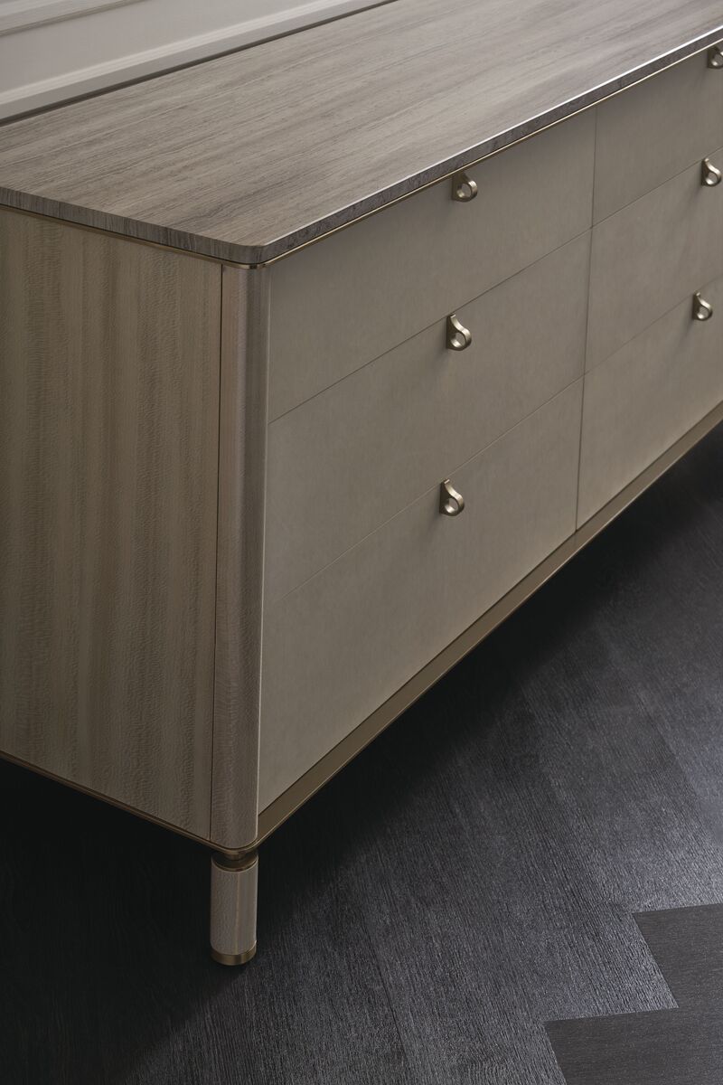 Нежные оттенки и естественные текстуры в идеальном сочетании создают изысканную современную элегантность комода Balance. Мягкие и приятные на ощупь ящики, обтянутые винилом, прекрасно гармонируют с шпоном древесины Silver Platano и блеском полированного камня травертин на столешнице. Металлические акценты и основание в оттенке Lucent Bronze придают тепло и при этом создают изысканный контраст к спокойной и чистой форме.