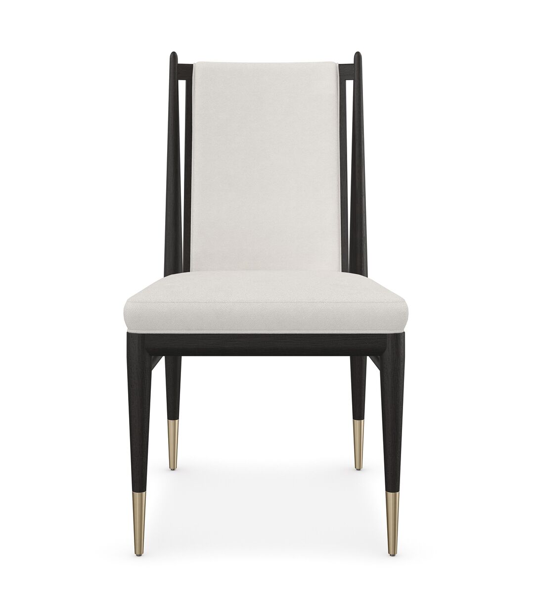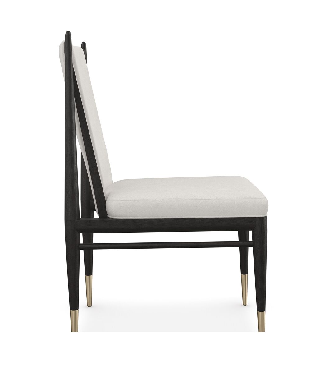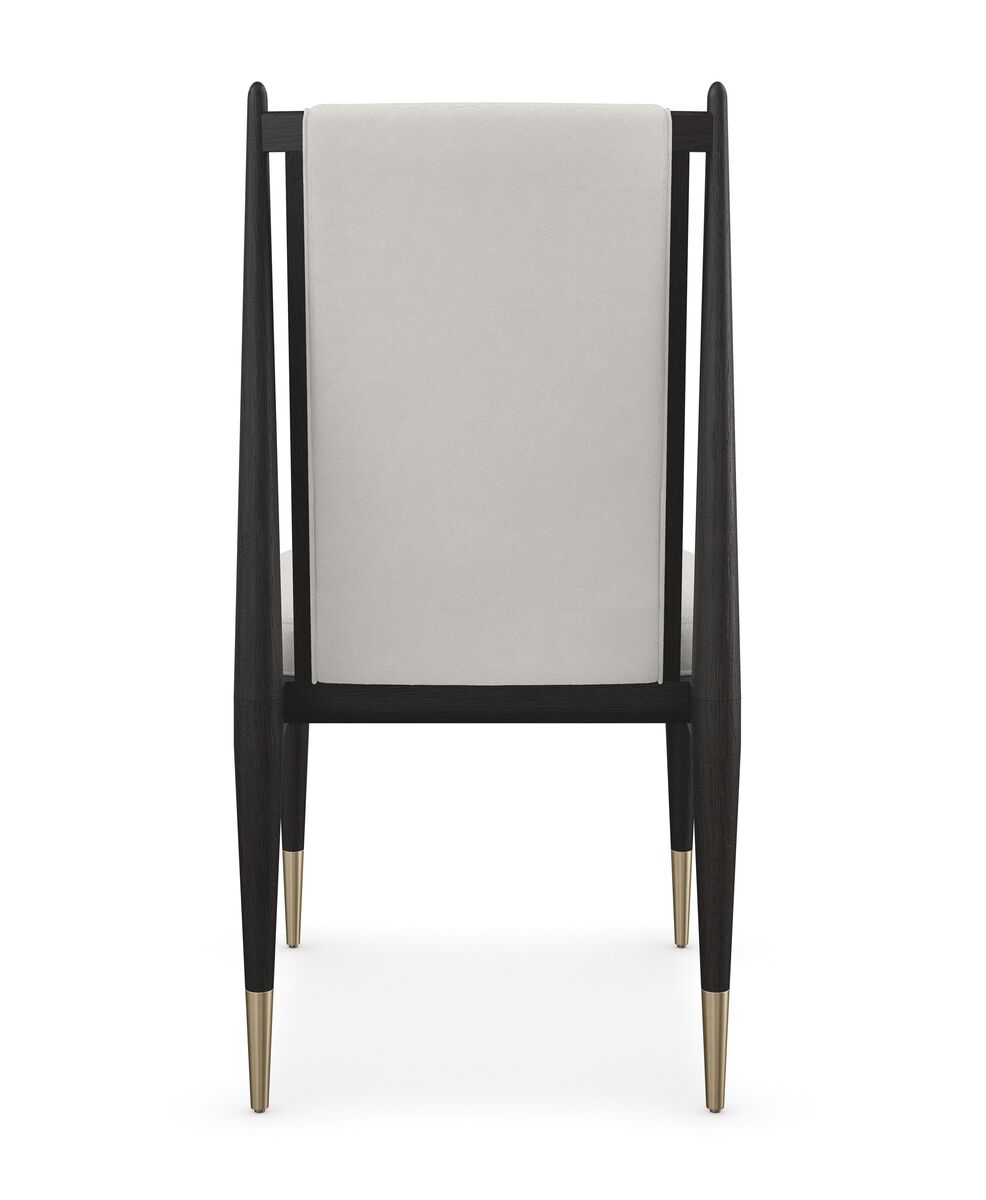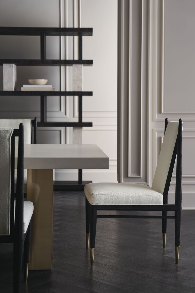 Элегантное сочетание материалов и формы делает темный обеденный стул Unity идеальным для разнообразных событий и повседневного использования. Чистый каркас из дуба с отделкой Cinder выделяется на фоне светлых вариантов. Обивка из ткани «букле» в оттенке слоновой кости, дополненная металлическими обоймами цвета Lucent Bronze, создает драматический контраст, придавая интерьеру столовой изысканную современную эстетику.