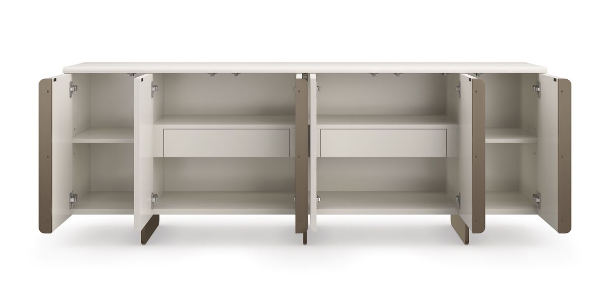 Буфета Emphasis - инновационная текстурированная отделка под саман придает глубину и органический элемент этому современному варианту итальянского дизайна 1940-х годов.Линейная форма с мягко закругленными краями и дверцами с плавным закрыванием создают элегантный облик, дополненный металлическими вставками Lucent Bronze Metallic, добавляющими теплоты и изысканности. Универсальная как по форме, так и по функциональности, буфет предлагает шикарное решение для хранения вещей в столовых, гостиных, прихожих и домашних офисах.