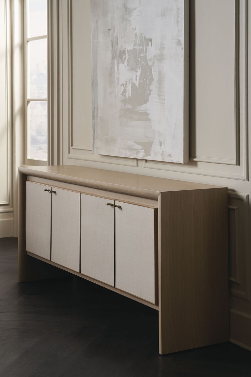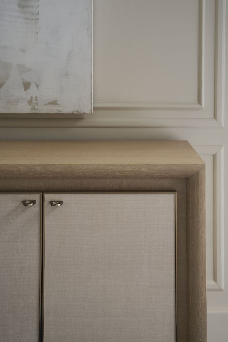 Благодаря тонкому контрасту светлых тонов и текстур, Буфет Unity Credenza приносит в интерьер элегантную современную эстетику, идеально вписываясь в гостиные, столовые и домашние офисы. Чистая форма элегантно подчеркивается отделкой «Sun Drenched Oak» и округлыми скосами, создающими обрамление вокруг дверц с мягким закрытием, обтянутыми винилом. Металлическая отделка Lucent Bronze придает теплоту и изысканность. Завершает этот успокаивающий ансамбль материалов и отделок интерьер, окрашенный в почти белый цвет, с регулируемыми полками для удобного и универсального хранения.