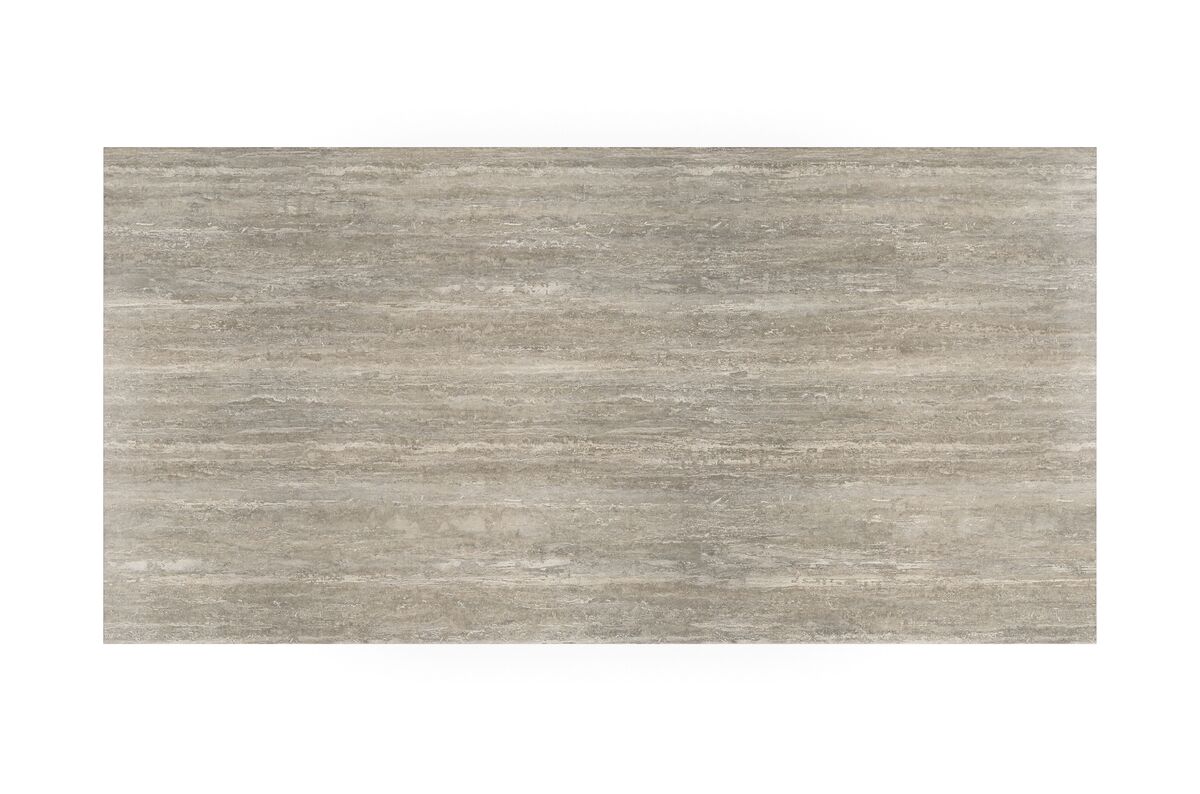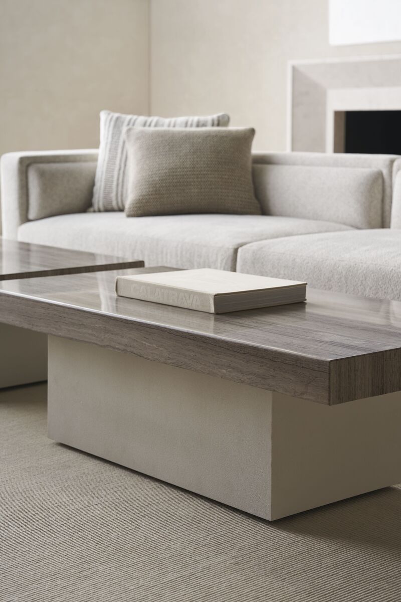 Столешница из камня Silver Travertine сочетается с основанием в виде столбика с тонкой текстурой в отделке под саман, создавая элегантный и лаконичный образ.