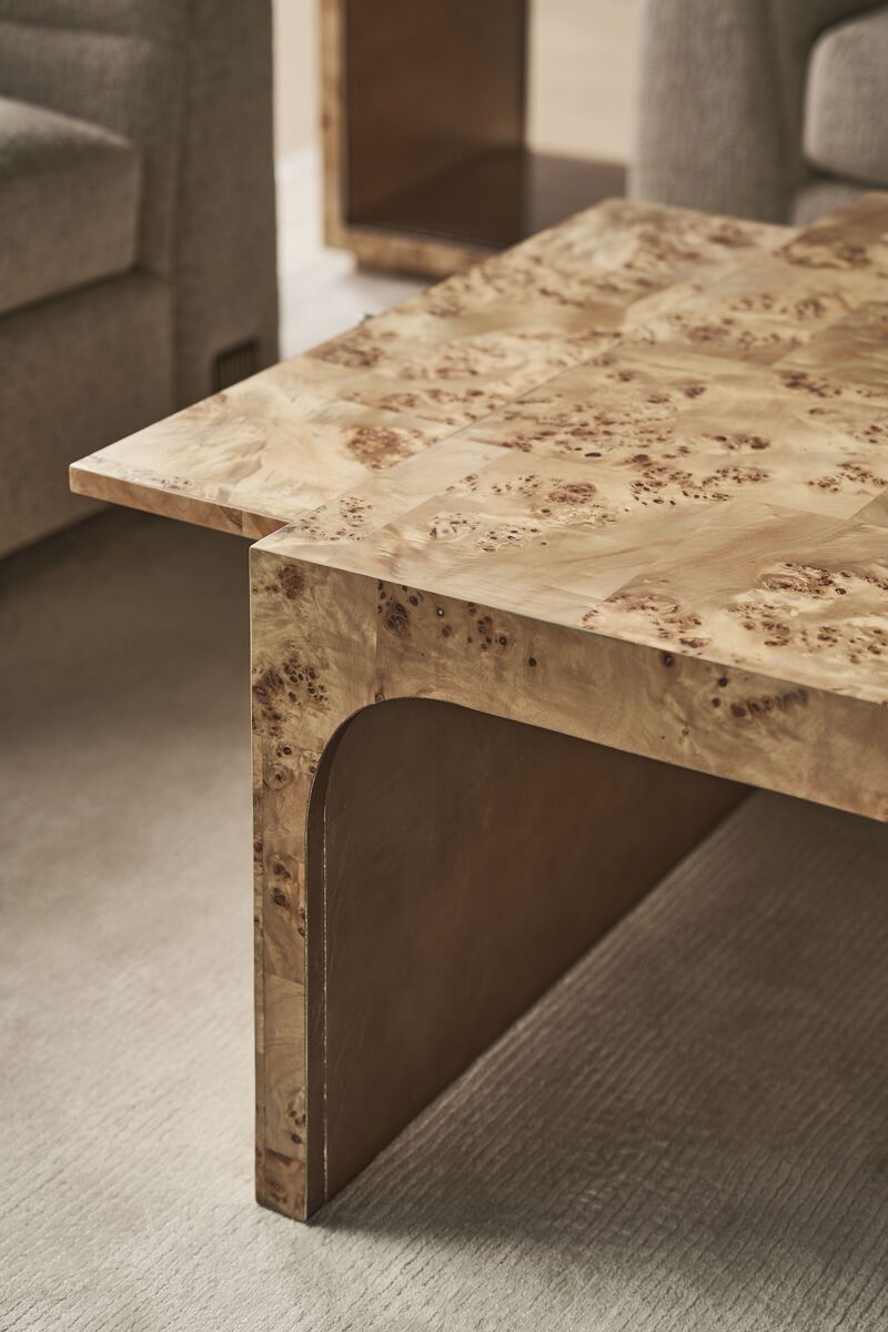 Столик изготовлен из высококачественного шпона маппа, который славится уникальной текстурой.