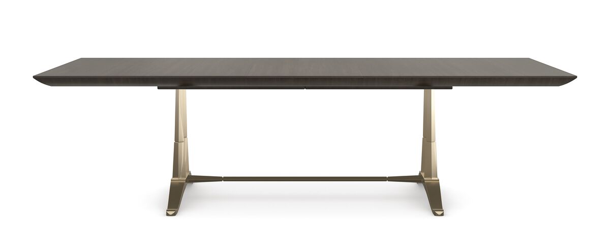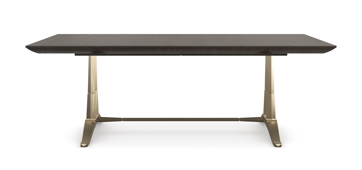 Широкая столешница, изготовленная из богатой зернистой фанеры тупело в отделке Otter, согревает пространство теплом. Она сбалансирована на прочном металлическом каркасе цвета Champagne Gold, который придает столу легкость и воздушность.
