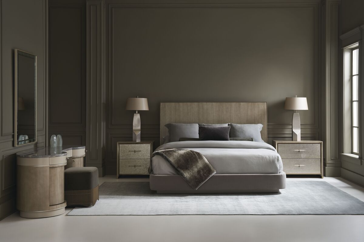 Изголовье в форме парсуны, искусно выполненное из шпона Koto и покрытое матовым золотом, притягивает взгляд своей необычной текстурой и благородным блеском. Отделка Dry Martini подчеркивает красоту изголовья, создавая гармоничный контраст с остальной частью кровати.