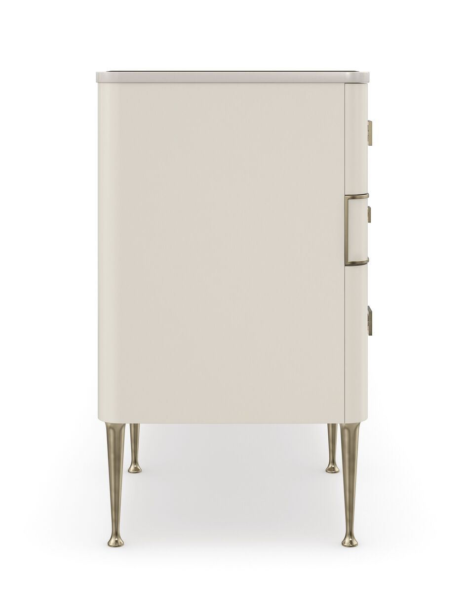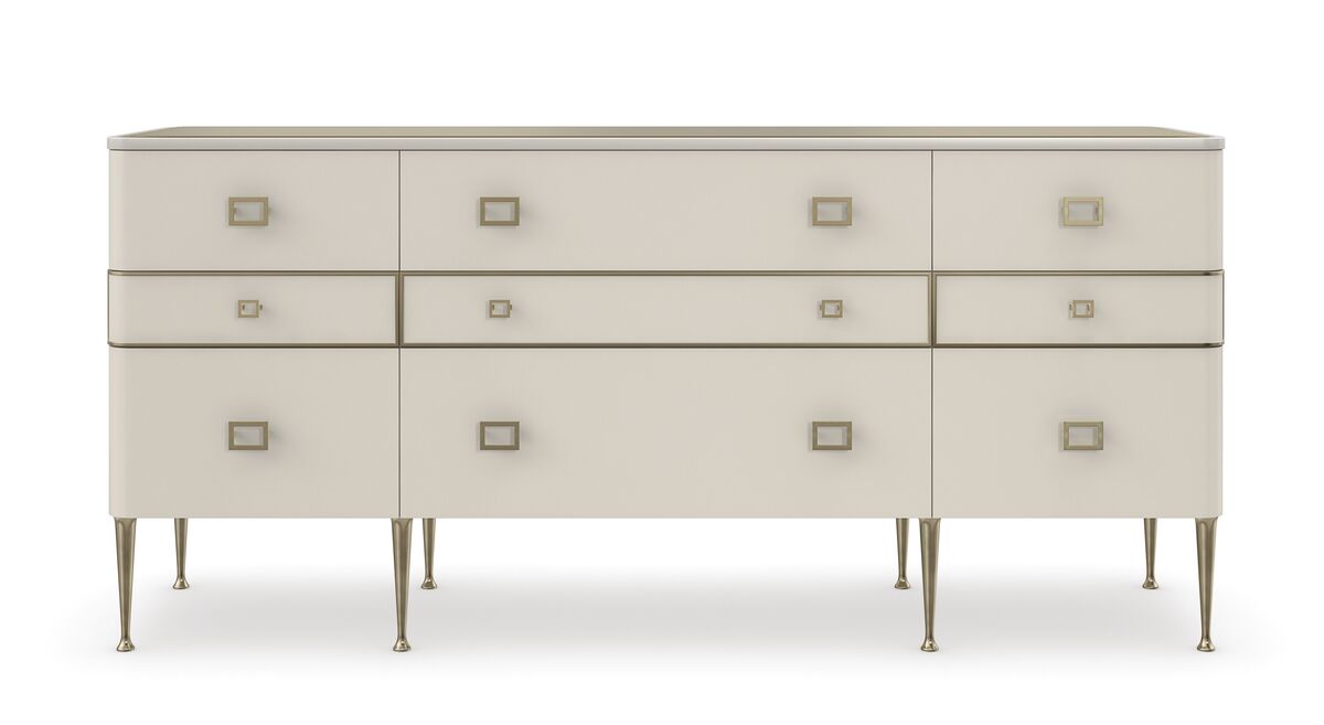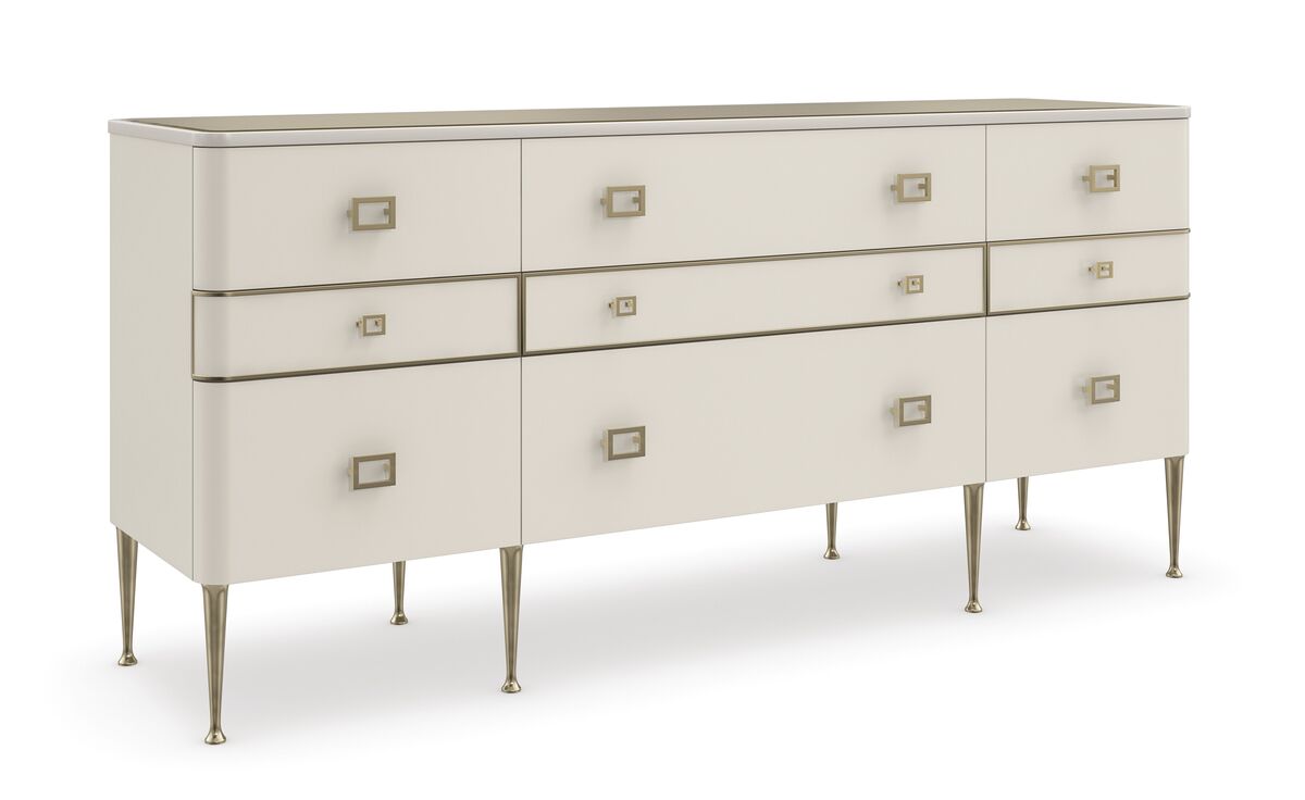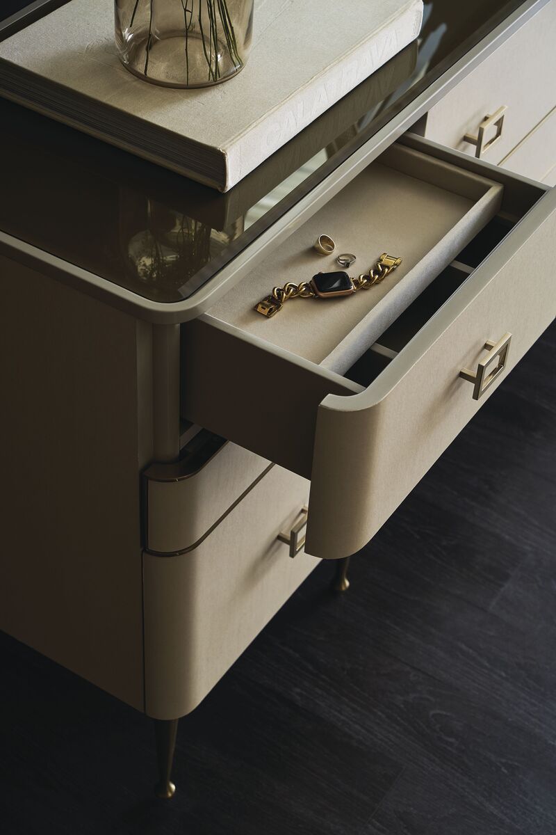 Просторный комод Curtain Call обтянут роскошной веганской кожей и украшен точеными ножками из металла с покрытием Brushed Gold. Основной акцент направлен на стеклянную столешницу цвета дымчатой бронзы и дизайнерская фурнитура, имитирующая пряжку сумки. Ящики обеспечивают достаточно места для хранения, а внутренняя отделка, разделители и виниловые накладки обеспечивают организацию пространства.