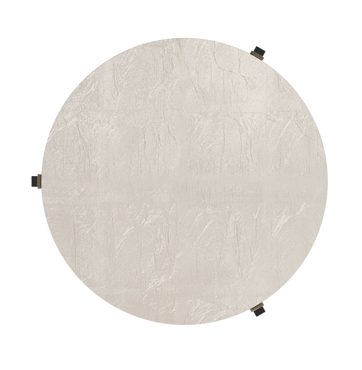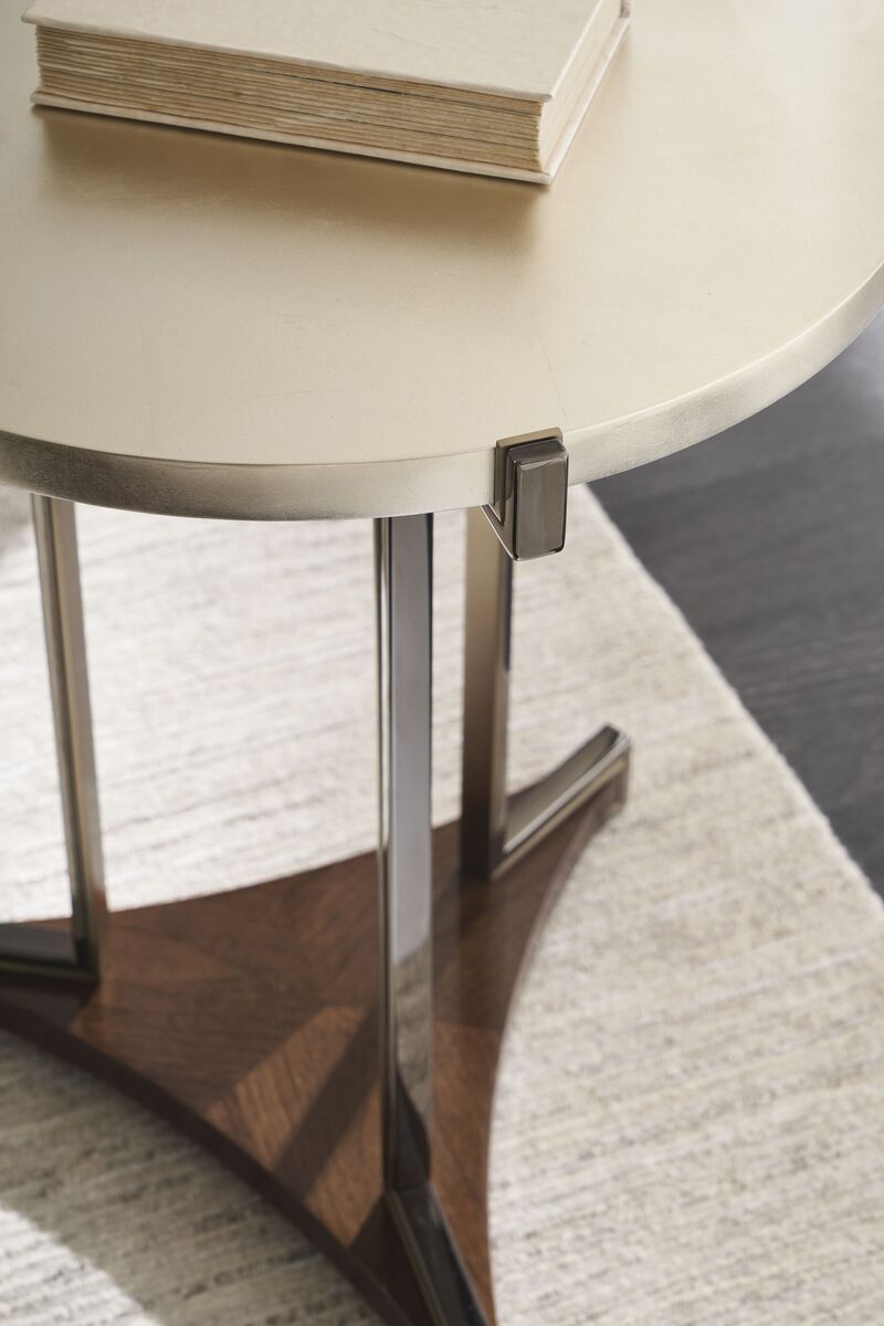 Его столешница с изысканным покрытием из мягкого серебристого листа эффектно контрастирует с нижней полкой из натурального орехового дерева. Металлические ножки в форме греческого ключа, выполненные в оттенках бронзы и платинового золота, придают изделию утончённый характер и подчеркивают его архитектурный дизайн.