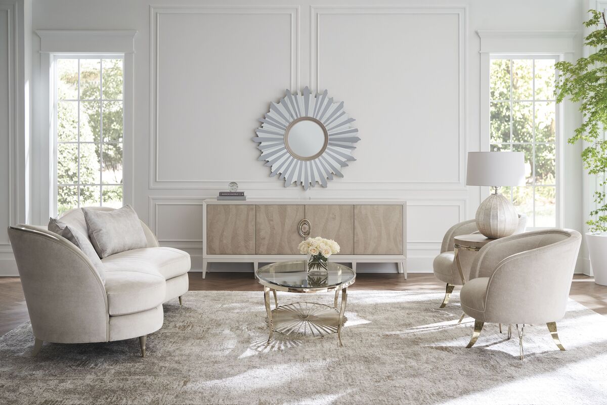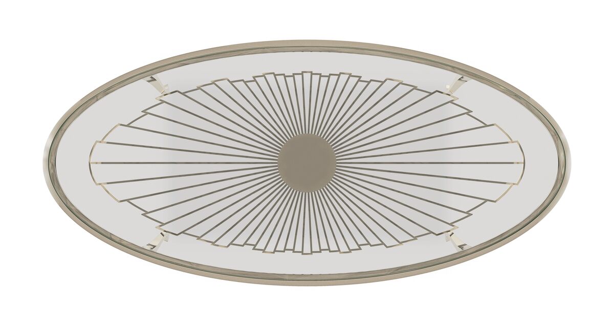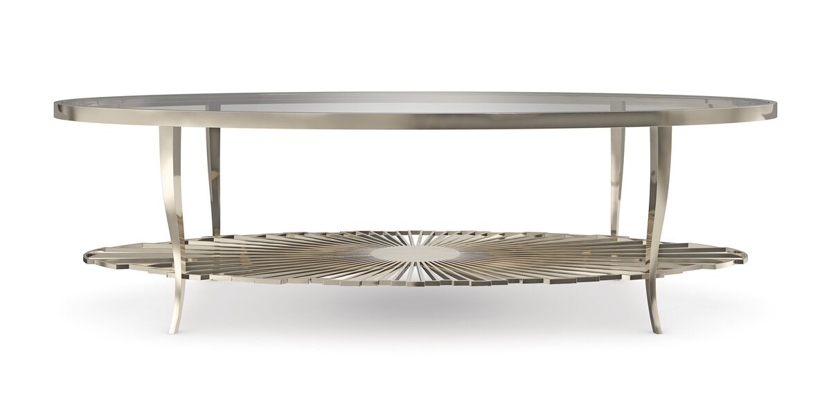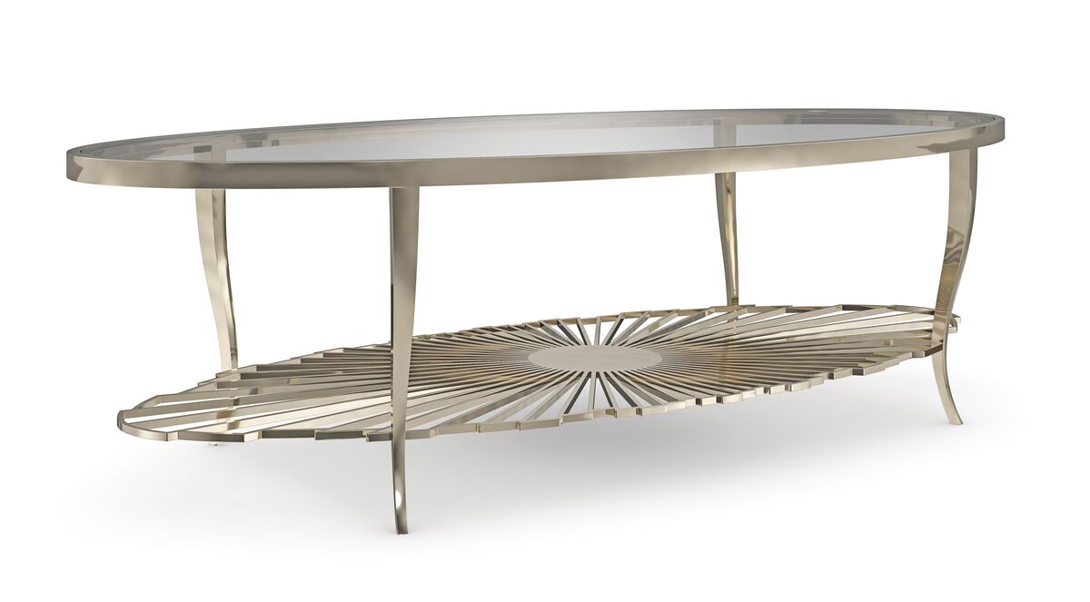 Журнальный столик Pirouette, излучающий и отражающий свет, является поразительным, но элегантным центром внимания. Привлекательный дизайн, напоминающий модерн, резко очерчен веерообразными металлическими подрамниками, которые служат открытой полкой, как бы парящей между квадратными саблевидными ножками. Отделка "Шепот золота" добавляет блеск Pirouette.