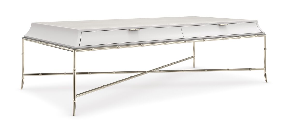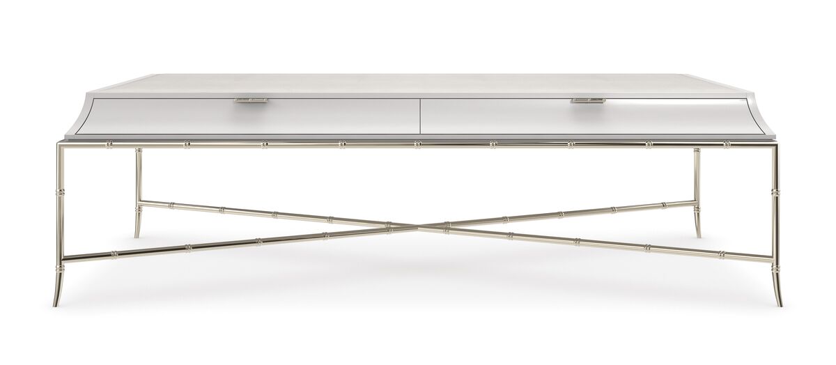 Сочетание современных материалов с традиционными азиатскими мотивами придает коктейльному столику Tea Time изысканную простоту. Он утонченно возвышается на металлической раме и подрамнике, имитирующем бамбук, обрамляющем основание. Ящик в стиле пагоды, окрашенный в нежный оттенок миндального молока, украшен столешницей из искусственной шагрени. Два тонких выдвижных ящика с лакированной внутренней отделкой предлагают скрытое хранение для книг и журналов, дополняя функциональность этого изящного столика.