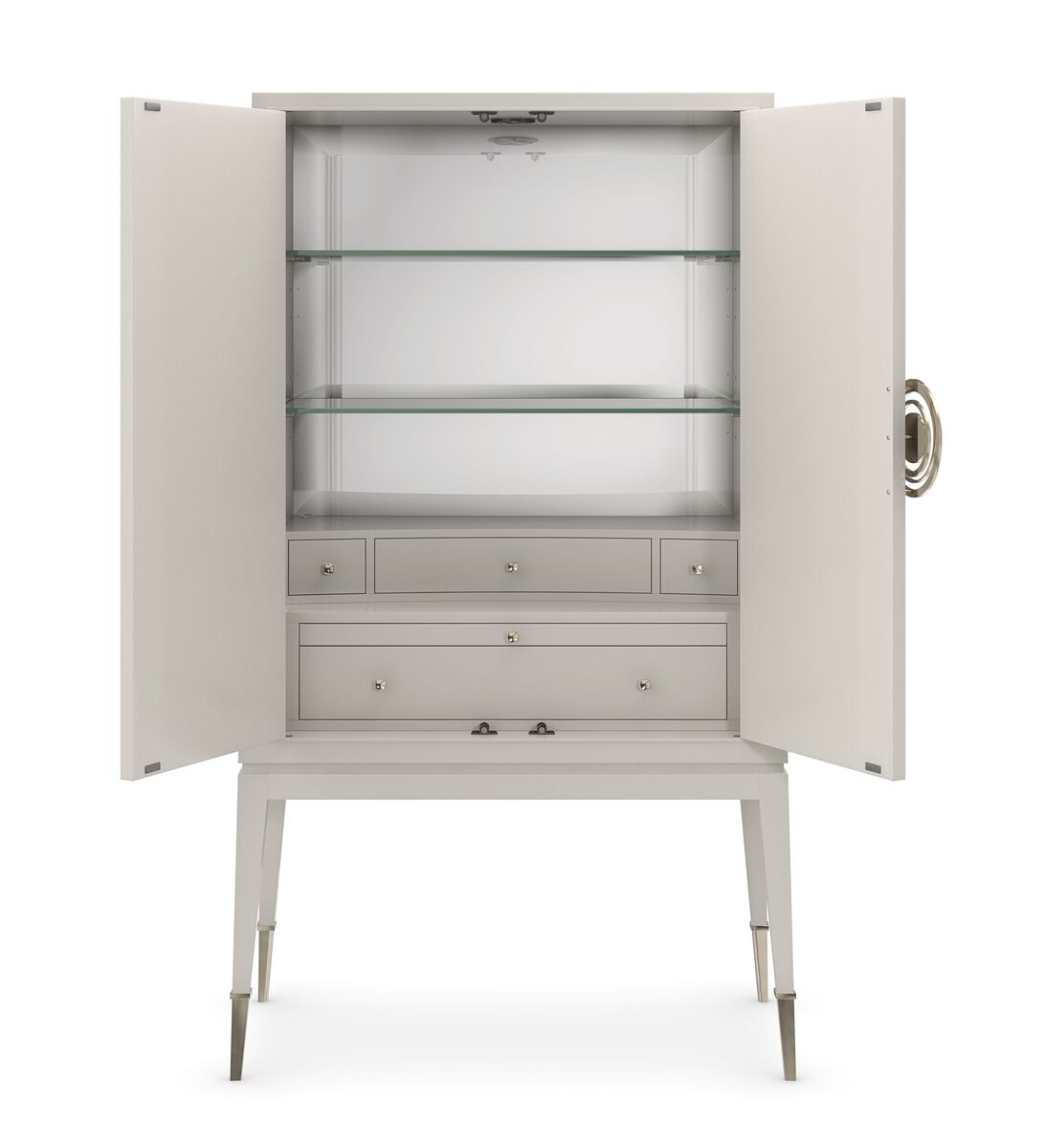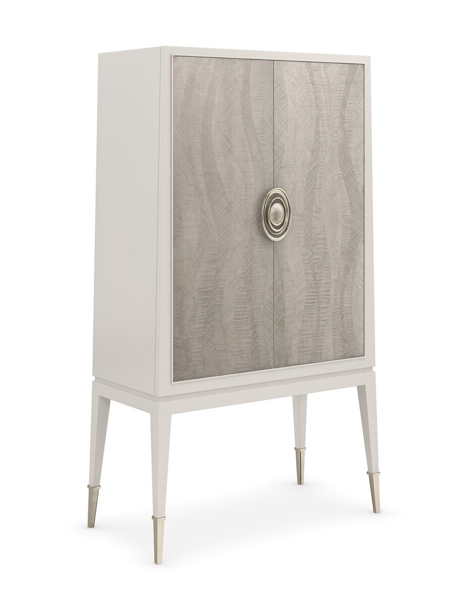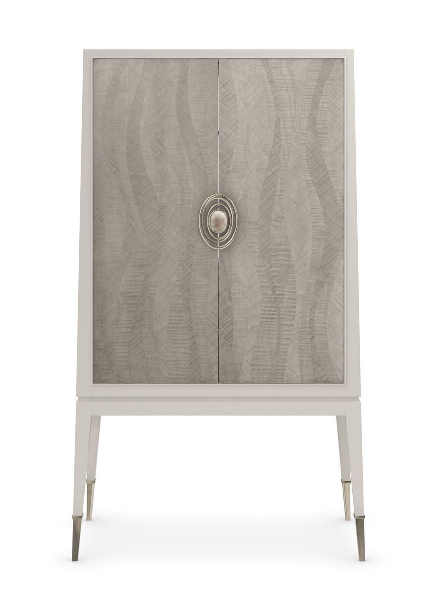Изысканный шкаф Currents, сочетающий органические элементы и роскошь, впечатляет линейной текстурой серого клена, которая умело раскладывается в узор, напоминающий рябь водной поверхности. Фокус внимания привлекает фурнитура, словно драгоценные камни, встроенные в поток, дополненная металлическими ободками в оттенке "Whisper of Gold". Внутри открывается зеркальный интерьер с подсветкой, оснащенный регулируемыми полками, углубленными ящиками и выдвижной рабочей поверхностью для приготовления и сервировки блюд.