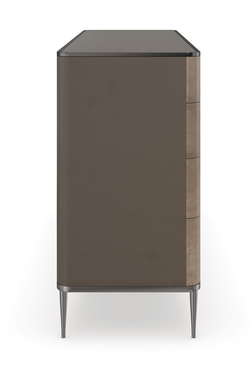 Элегантный комод Prism, изготовленный из темного клена, украшен шпоном с изящным узором, состоящим из звездочек, которые расходятся вверх и наружу от нижних ящиков. Его мягкие, округленные края придают изысканную и органичную эстетику. Комод отделан оттенком Galaxy Bronze и дополнен металлическими акцентами цвета Deep Bronze. Для усиления выразительности использованы окрашенные внутренние поверхности ящиков и фурнитура с гранеными деталями, изготовленная из смолы в оттенке слоновой кости и оформленная металлическими вставками в цвете глубокой бронзы.