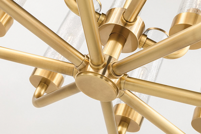 Люстра Soriano очаровывает своим изысканным дизайном: длинные рассеиватели, напоминающие элегантные держатели для свечей с текстурой кракелюра, мягко приглушают теплый свет, создавая эффект ледяного сияния. Роскошный оттенок благородной латуни Aged Brass гармонично сочетается с бронзой Old Bronze, формируя выразительный контраст в черно-золотой палитре. Это сочетание придает люстре не только неповторимый шик, но и утонченную элегантность, способную стать изюминкой любого интерьера гостиной комнаты.