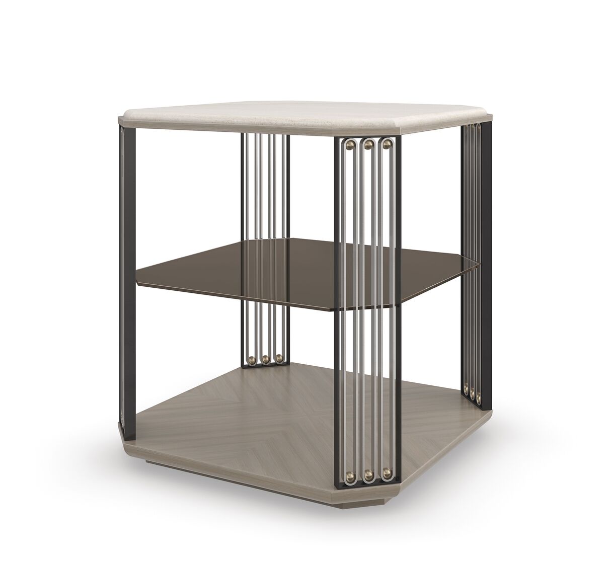 Стеклянная полка в дымчато-бронзовой отделке, кажущаяся плавающей, придает очарование этому боковому столику, вдохновленному изысканными металлическими работами знаменитого французского дизайнера Жана Пруве. Декоративные ножки, мастерски выполненные из сплава металлов глубокой бронзы, матового золота и матовой нержавеющей стали, завершаются камнем Crème Travertine. Солидная по форме, но в то же время воздушная конструкция предоставляет достаточно свободного пространства для размещения книг и предметов искусства.