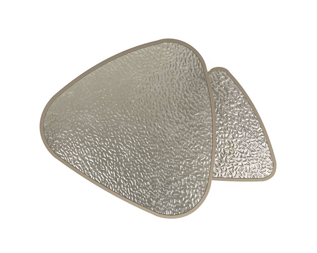 Подчеркивая классический стиль мужской моды, эти два боковых столика привлекают внимание своим уникальным сочетанием художественности и элегантности. Кроме того, эти изысканные столики с коническими ножками цвета матового золота восхищают простотой формы бумеранга, которую можно наклонять для создания удивительной композиции. Они приобретают дополнительный шарм благодаря мерцающему, тактильному волнистому стеклу, покрытому листьями в отделке Winter Frost.