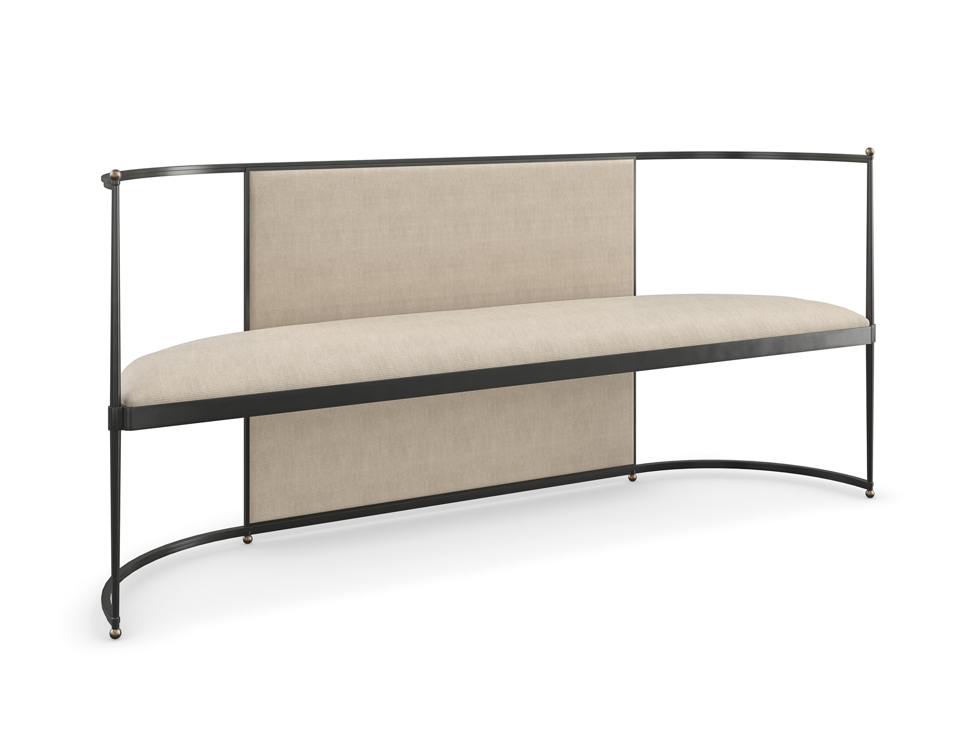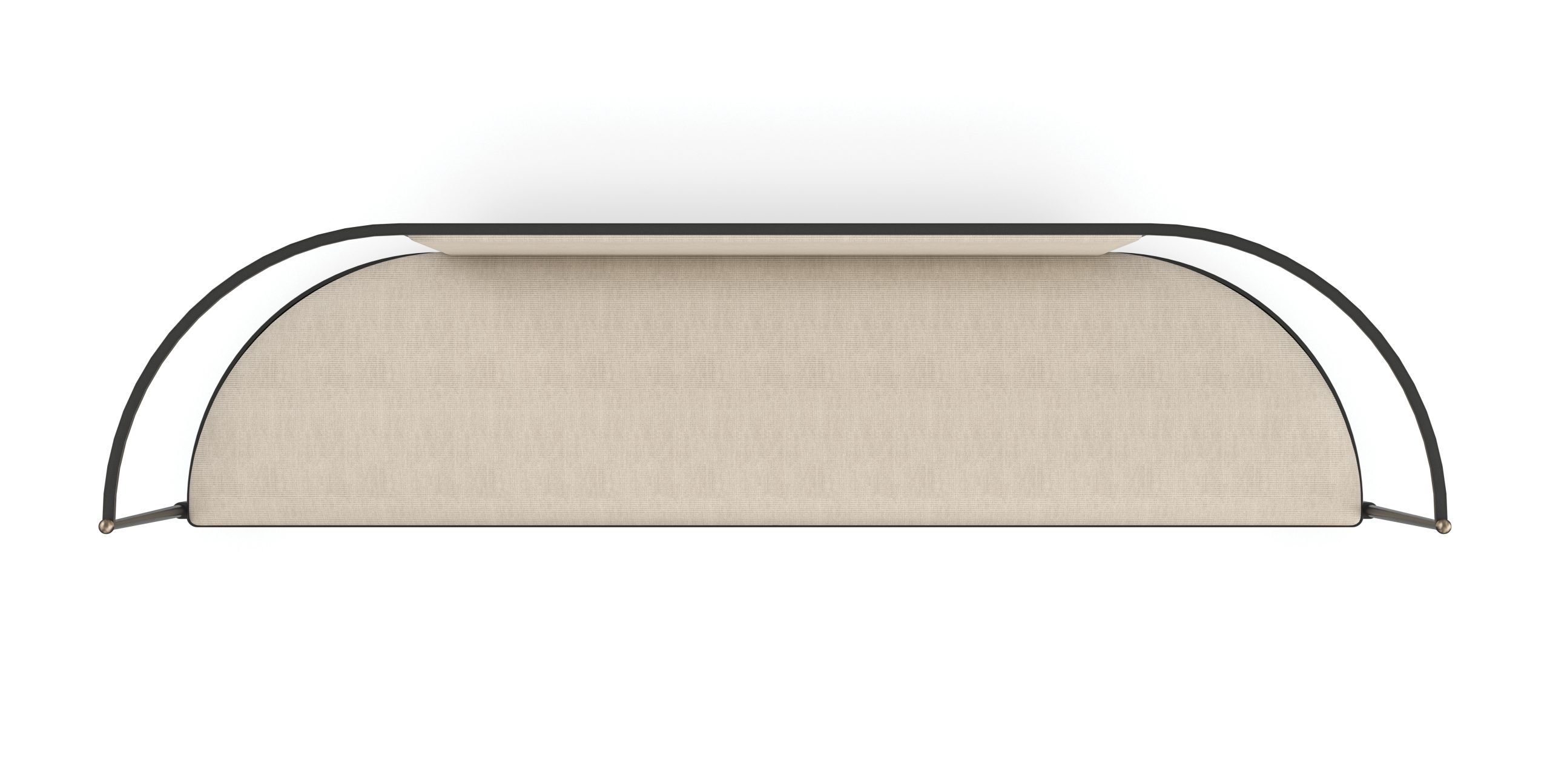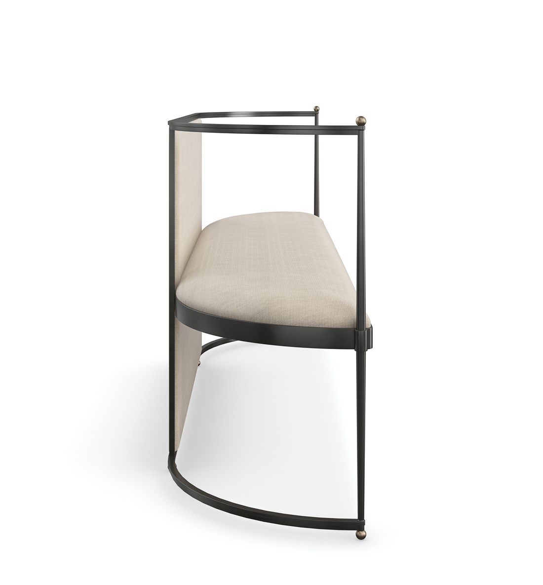 Банкетка Touluse, обитая шерстяной тканью в изящную микрополоску, воплощает шарм загородного дома, вдохновленный кованой мебелью французских садов-патио. Ее изогнутый металлический каркас создает ощущение легкости и тепла, дополненное тонким мерцанием декоративных шариков в отделке Brushed Gold.
