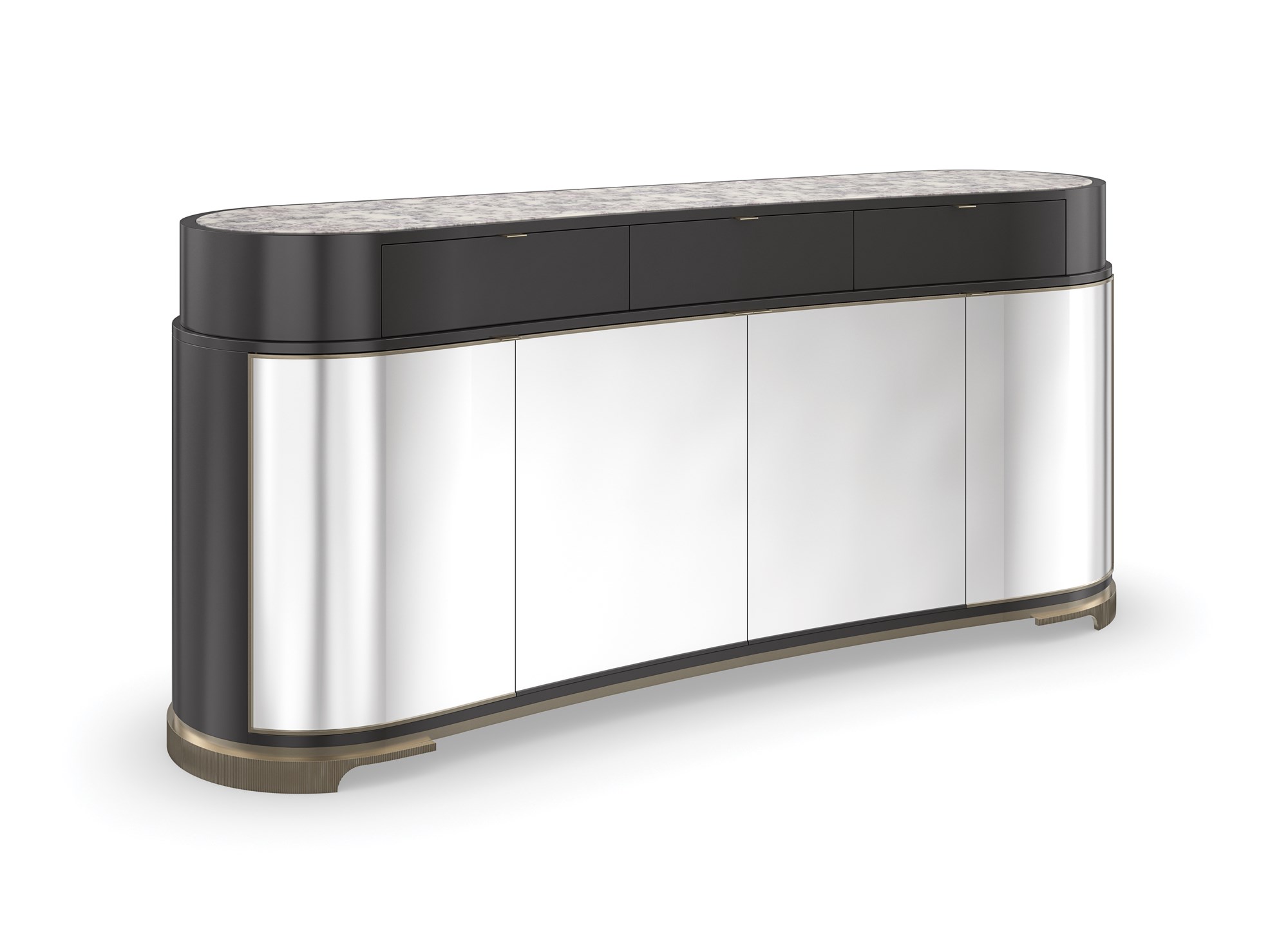 Буфет Glace — это воплощение элегантности и оригинальности, вдохновленное формой ведерка для льда из полированного металла. Его изысканный дизайн отличает классическая форма в виде почки, подчеркнутая отделкой Almost Black и фасадами дверей с мерцающим серебристым эффектом. Элементы из бусин матового золота добавляют изысканный акцент.