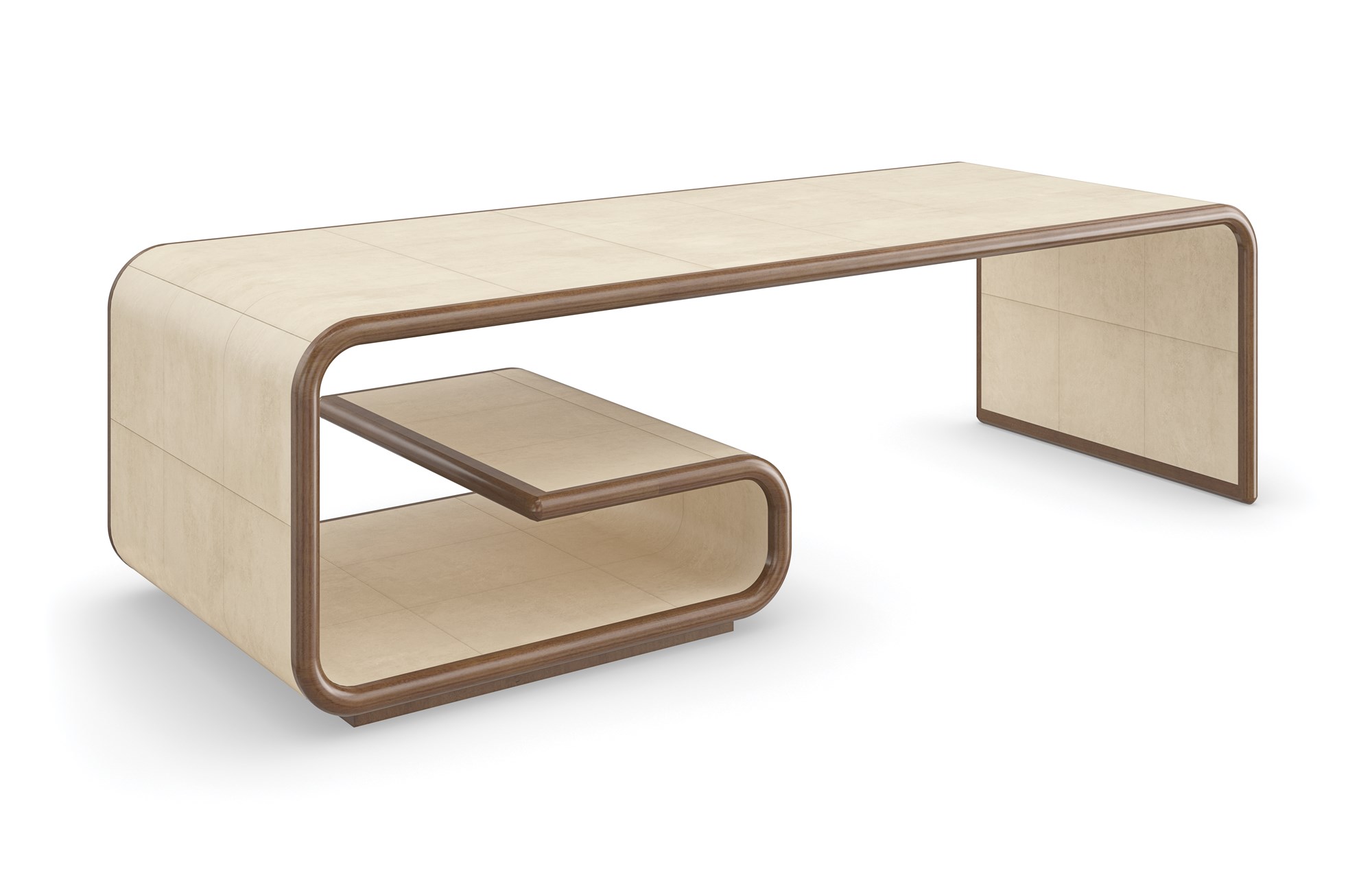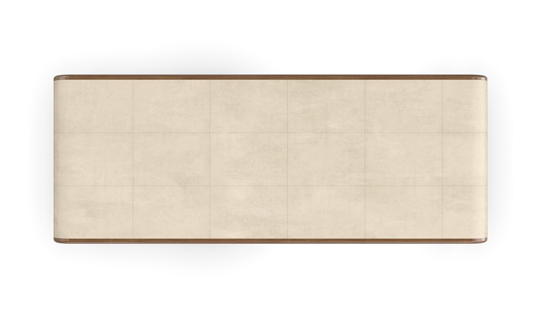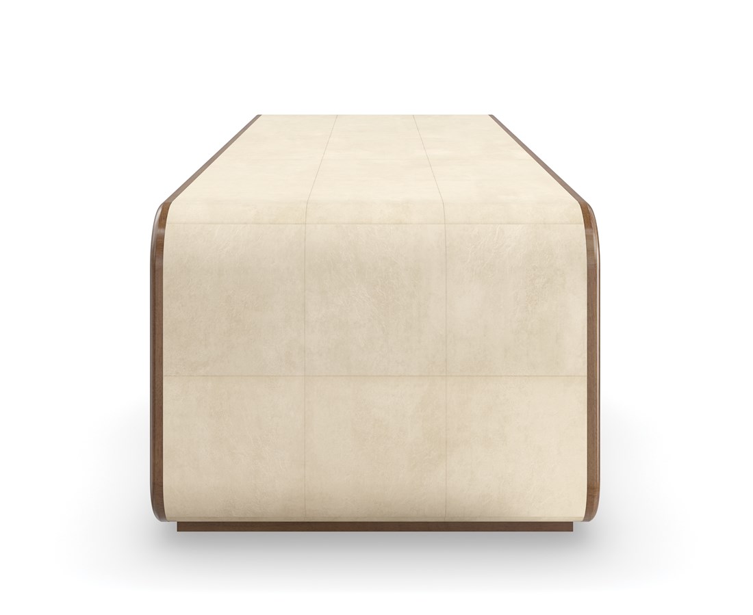 Стол обтянут пергаментом цвета слоновой кости, дополненным отделкой из поджаренного сикомора, что подчеркивает гармонию текстур и придает изделию изысканную прибрежную атмосферу. Его плавная, органическая форма не только привлекает взгляд, но и позволяет эффективно использовать пространство.