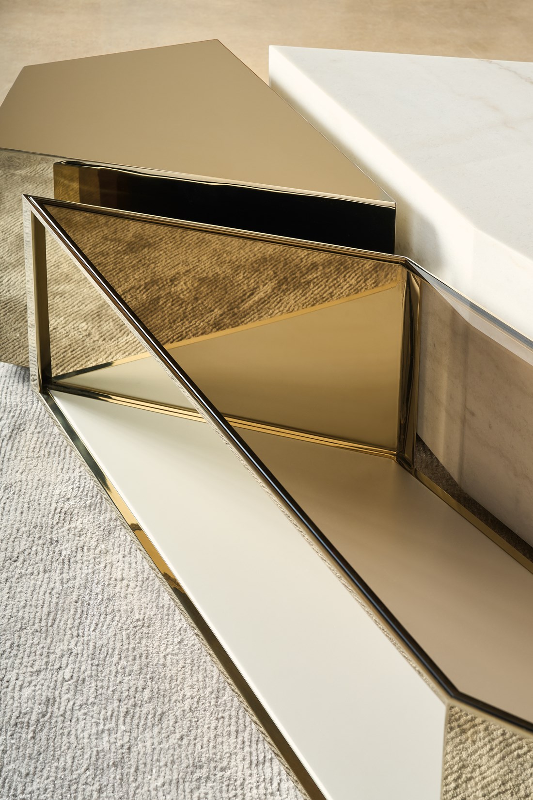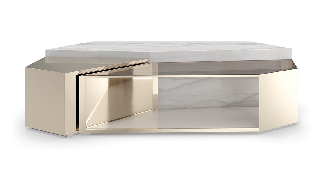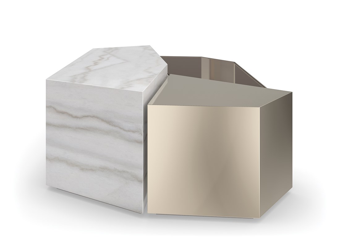 Журнальный стол The Amara — это изысканная композиция из металла, стекла и мрамора, вдохновленная формами драгоценных камней. Его многослойная структура играет на свету, создавая мерцающие эффекты и приглашающие к размышлению моменты.