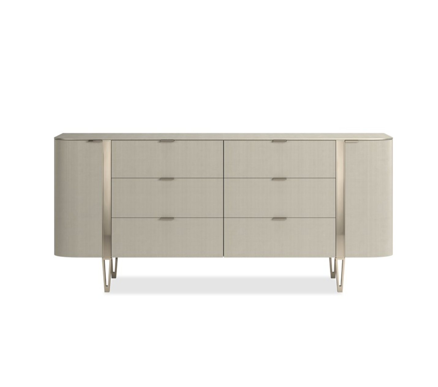 Два торцевых отделения с внутренними полками обеспечивают удобство хранения, а шесть центральных ящиков добавляют пространства для организации. Покрытие Oracle акцентирует внимание на изысканной резьбе фасадов, которую подчёркивает металлическая лента цвета Whisper of Gold. Дизайнерские ножки завершают образ, добавляя лёгкости и утончённости конструкции.