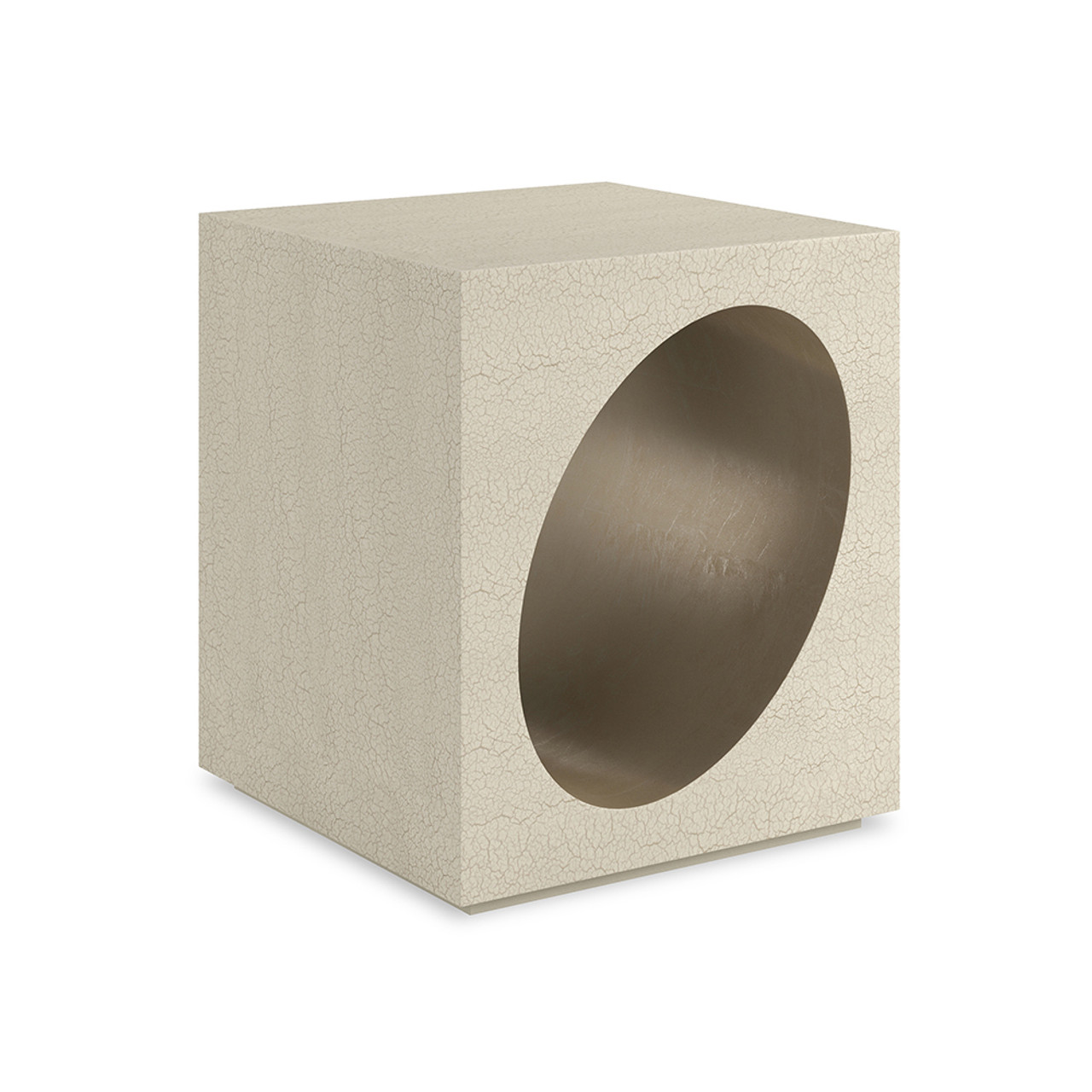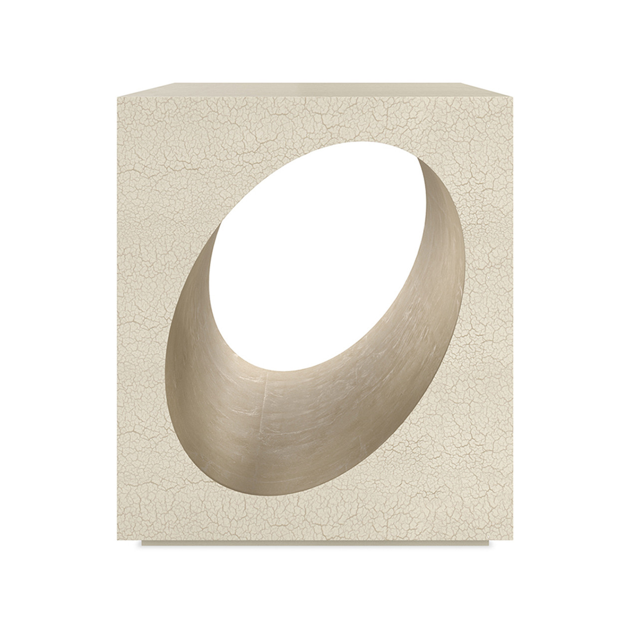 Его квадратная форма привлекает внимание смещённым овальным отверстием в центре, создающим эффект глубины. Внешняя поверхность стола покрыта кракелюрной отделкой Ivory Craze, которая имитирует структуру современного камня и добавляет текстурный интерес. Особый акцент придаёт внутренняя часть отверстия, мерцающая серебристой отделкой в оттенке Taupe, создавая эффект завораживающей пропасти.