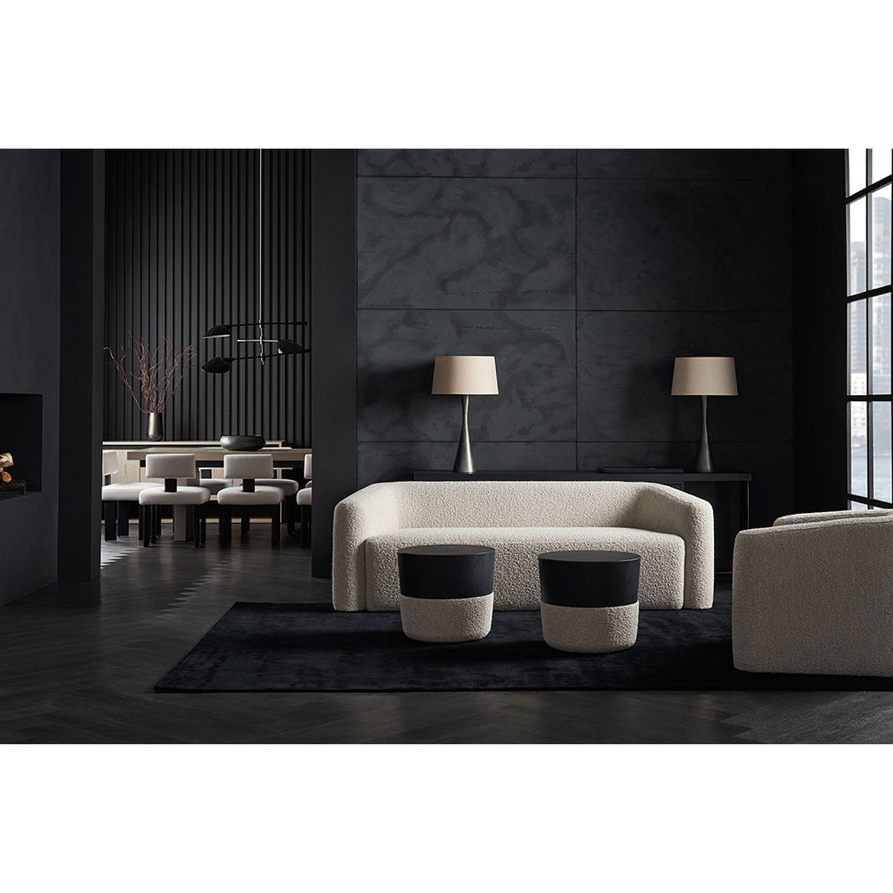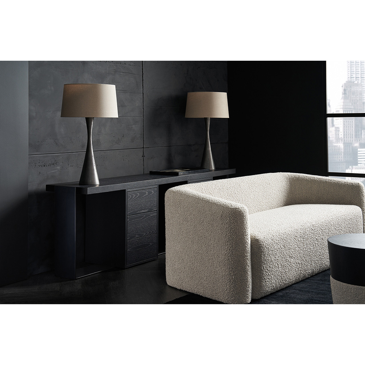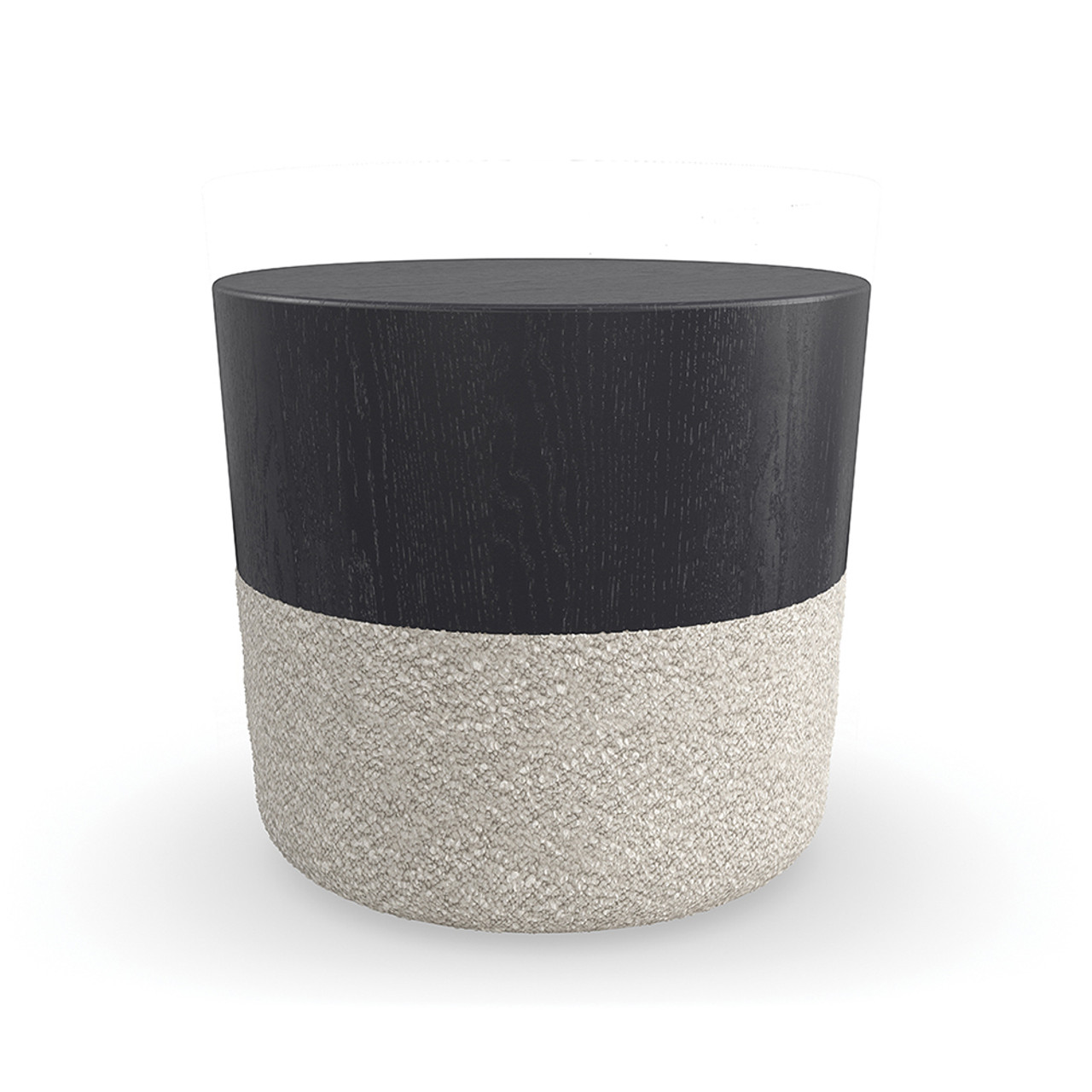 Его овальная форма и изящное коническое основание, обтянутое тканью букле, создают ощущение тепла и уюта, подчеркивая утончённую материальность дизайна. Столешница из матового чёрного шпона добавляет современный штрих, обеспечивая долговечность и функциональность.