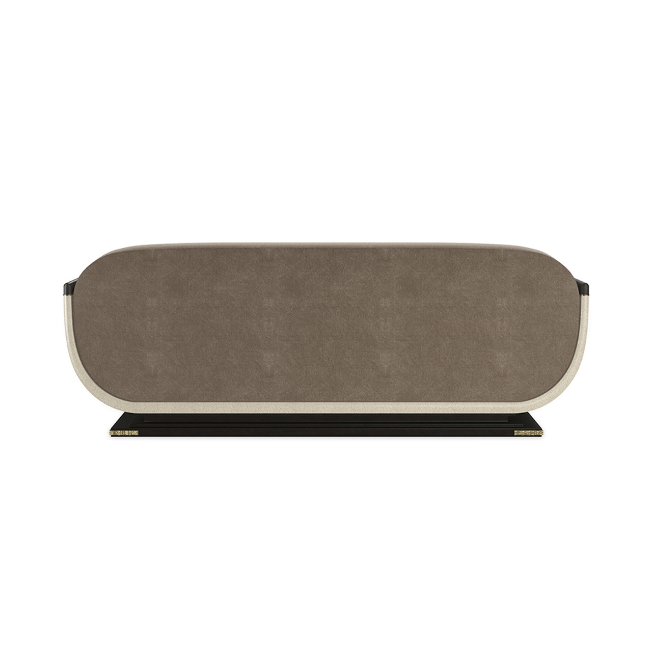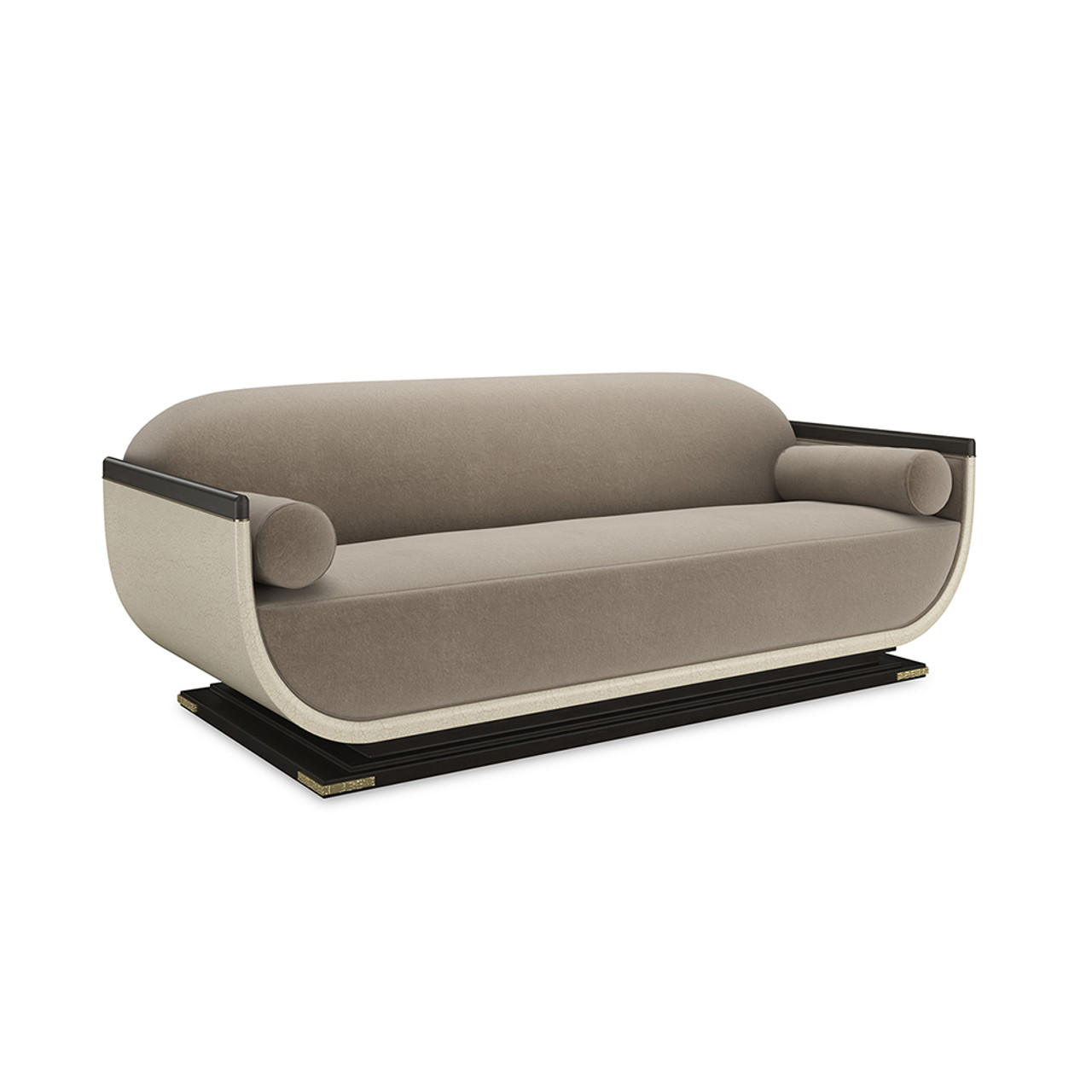 Дизайн дополнен ярусным основанием цвета Charred Bark, украшенным элегантными металлическими аппликациями на углах, выполненными в тоне Brushed Gold. Роскошная внутренняя обивка и мягкие подушки, обтянутые бархатом из искусственного мохера благородного грибного оттенка, придают дивану не только визуальную притягательность, но и ощущение непревзойдённого комфорта.