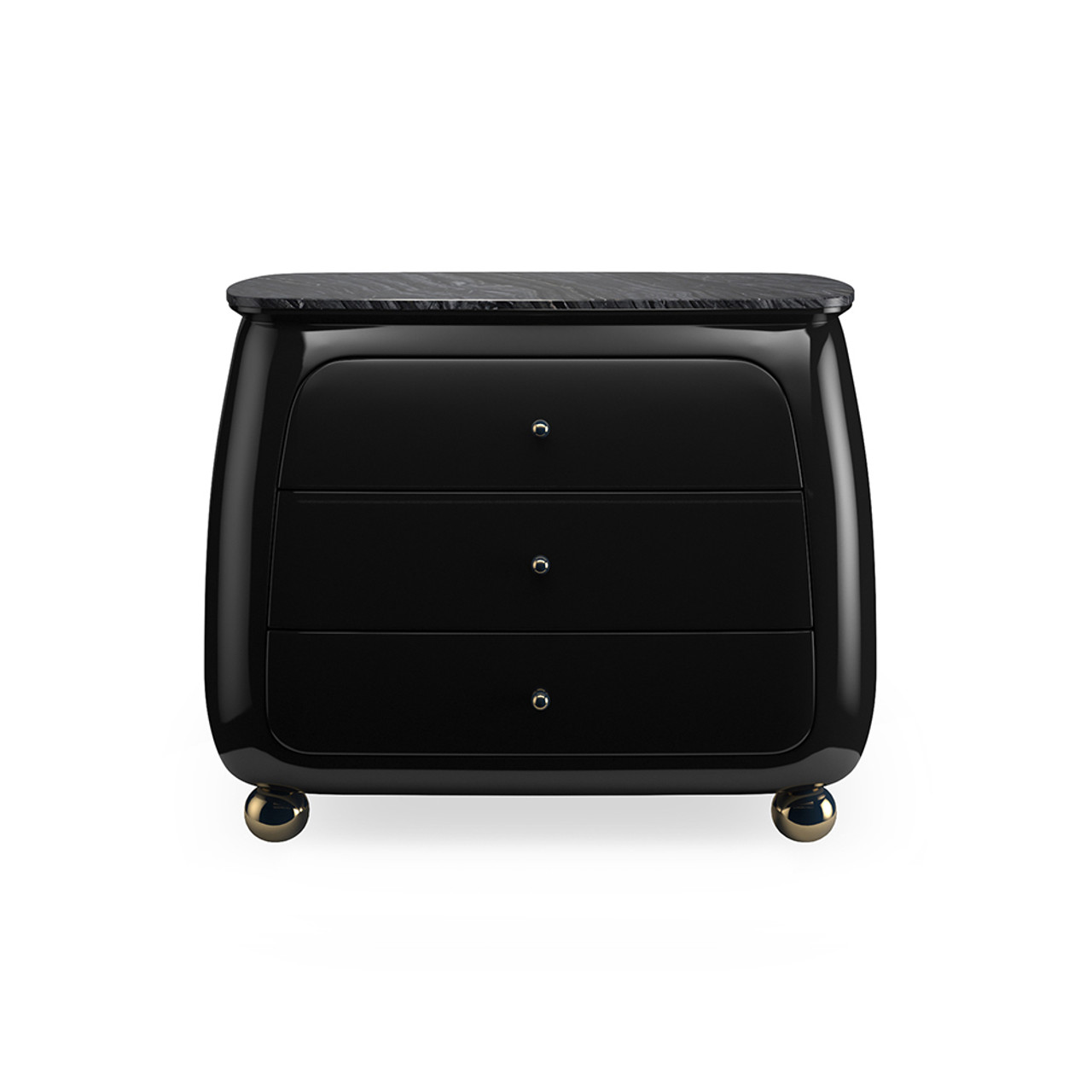 Как и одноименный драгоценный камень, прикроватная тумба Cabochon воплощает совершенство формы и отделки. Ее изящный округлый корпус выполнен в ультраглянцевом оттенке Piano Black, а столешница из черного и серого камня с безупречной полировкой придает изделию статусность.