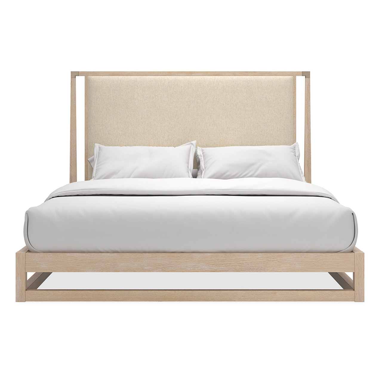 Рельефный реечный каркас выполнен из тщательно обработанного дуба теплого солнечного оттенка. Изголовье обито тканью цвета экрю с деликатным мерцанием, добавляющим утонченности. Окружающая дубовая рама с эффектом смещения дополнена элегантными металлическими кронштейнами в оттенке Champagne Gold, что подчеркивает современные линии дизайна.
